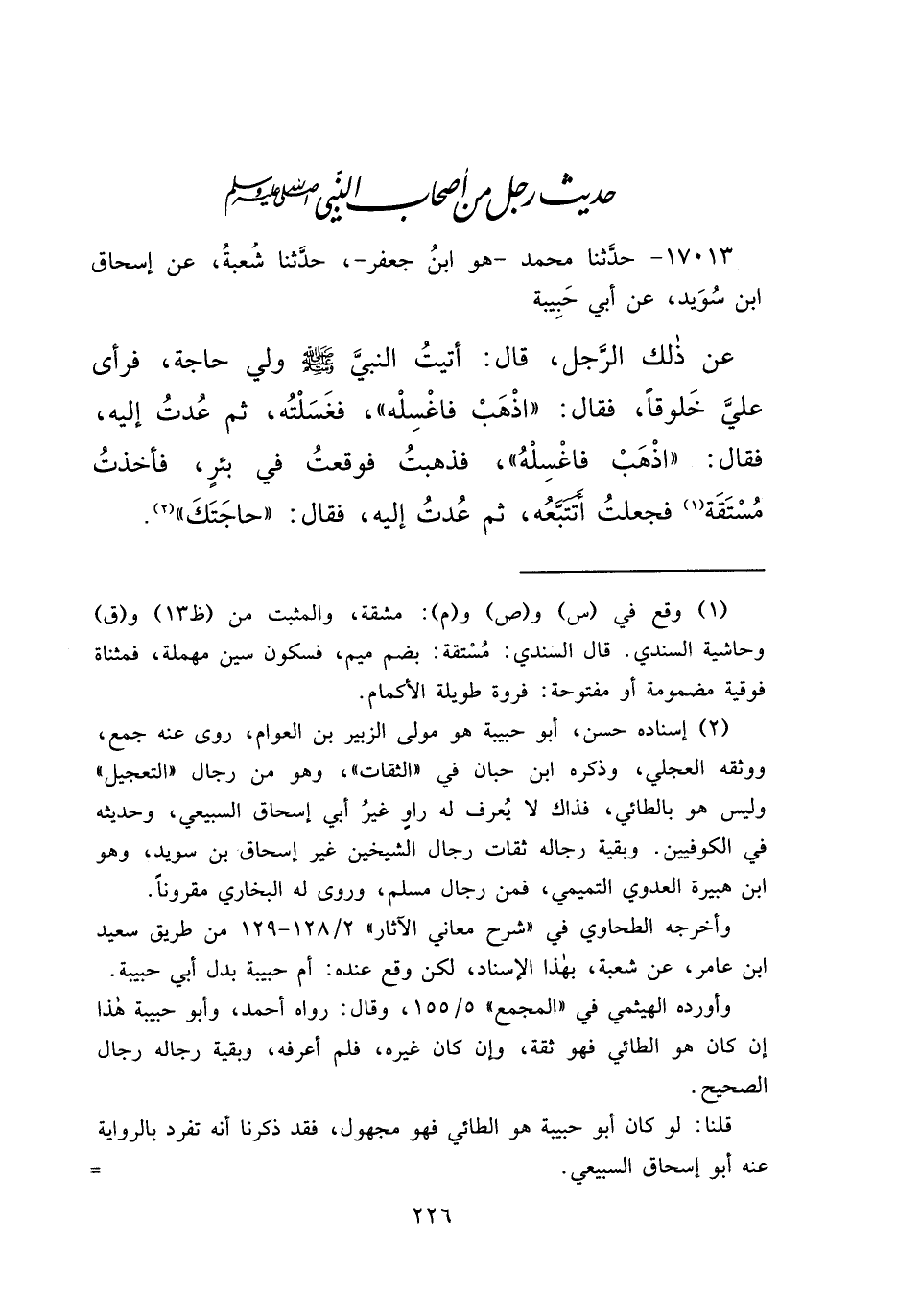 ١٧٠١٣ - حَدَّثَنَا مُحَمَّدٌ هُوَ ابْنُ جَعْفَرٍ، حَدَّثَنَا شُعْبَةُ، عَنْ إِسْحَاقَ بْنُ سُوَيْدٍ، عَنْ أَبِي حَبِيبَةَ، عَنْ ذَلِكَ الرَّجُلِ، قَالَ: أَتَيْتُ النَّبِيَّ صَلَّى اللهُ عَلَيْهِ وَسَلَّمَ وَلِي حَاجَةٌ، فَرَأَى عَلَيَّ خَلُوقًا، فَقَالَ: " اذْهَبْ فَاغْسِلْهُ " فَغَسَلْتُهُ، ثُمَّ عُدْتُ إِلَيْهِ، فَقَالَ: " اذْهَبْ فَاغْسِلْهُ "، فَذَهَبْتُ فَوَقَعْتُ فِي بِئْرٍ، فَأَخَذْتُ مُسْتَقَةً (١) فَجَعَلْتُ أَتَتَبَّعُهُ، ثُمَّ عُدْتُ إِلَيْهِ، فَقَالَ: " حَاجَتُكَ " (٢)