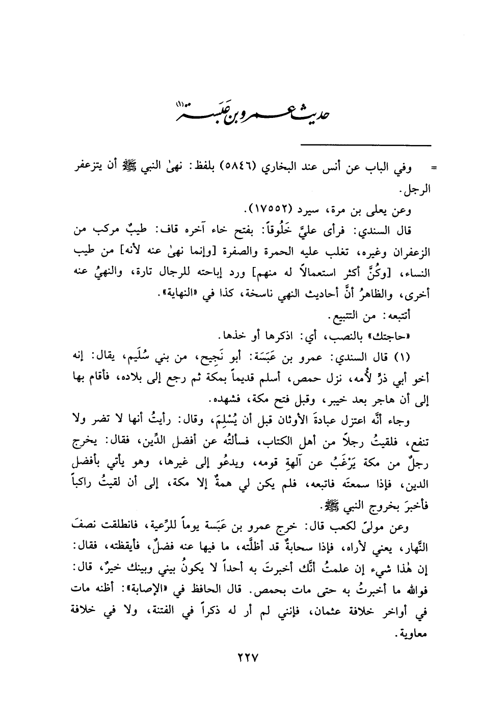 (١) قال السندي: عمرو بن عَبَسَة: أبو نَجِيح، من بني سُلَيم، يقال: إنه أخو أبي ذرٍّ لأُمه، نزل حمص، أسلم قديماً بمكة ثم رجع إلى بلاده، فأقام بها إلى أن هاجر بعد خيبر، وقبل فتح مكة، فشهده.