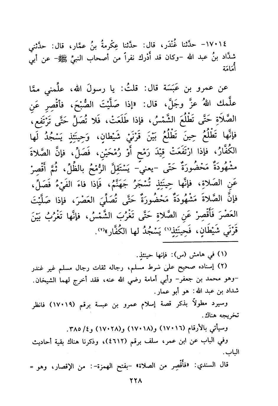 ١٧٠١٤ - حَدَّثَنَا غُنْدَرٌ، قَالَ: حَدَّثَنَا عِكْرِمَةُ بْنُ عَمَّارٍ، قَالَ: حَدَّثَنِي شَدَّادُ بْنُ عَبْدِ اللهِ - وَكَانَ قَدْ أَدْرَكَ نَفَرًا مِنْ أَصْحَابِ النَّبِيِّ صَلَّى اللهُ عَلَيْهِ وَسَلَّمَ -، عَنْ أَبِي أُمَامَةَ، عَنْ عَمْرِو بْنِ عَبَسَةَ، قَالَ: قُلْتُ: يَا رَسُولَ اللهِ، عَلِّمْنِي مِمَّا عَلَّمَكَ اللهُ عَزَّ وَجَلَّ، قَالَ: " إِذَا صَلَّيْتَ الصُّبْحَ، فَأَقْصِرْ عَنِ الصَّلَاةِ حَتَّى تَطْلُعَ الشَّمْسُ، فَإِذَا طَلَعَتْ، فَلَا تُصَلِّ حَتَّى تَرْتَفِعَ، فَإِنَّهَا تَطْلُعُ حِينَ تَطْلُعُ بَيْنَ قَرْنَيْ شَيْطَانٍ، وَحِينَئِذٍ يَسْجُدُ لَهَا الْكُفَّارُ، فَإِذَا ارْتَفَعَتْ قِيدَ رُمْحٍ أَوْ رُمْحَيْنِ، فَصَلِّ، فَإِنَّ الصَّلَاةَ مَشْهُودَةٌ مَحْضُورَةٌ حَتَّى - يَعْنِي - يَسْتَقِلَّ الرُّمْحُ بِالظِّلِّ، ثُمَّ أَقْصِرْ عَنِ الصَّلَاةِ، فَإِنَّهَا حِينَئِذٍ تُسْجَرُ جَهَنَّمُ، فَإِذَا أَفَاءَ الْفَيْءُ فَصَلِّ، فَإِنَّ الصَّلَاةَ مَشْهُودَةٌ مَحْضُورَةٌ حَتَّى تُصَلِّيَ الْعَصْرَ، فَإِذَا صَلَّيْتَ الْعَصْرَ فَأَقْصِرْ عَنِ الصَّلَاةِ حَتَّى تَغْرُبَ الشَّمْسُ، فَإِنَّهَا تَغْرُبُ بَيْنَ قَرْنَيْ شَيْطَانٍ، فَحِينَئِذٍ (١) يَسْجُدُ لَهَا الْكُفَّارُ " (٢)