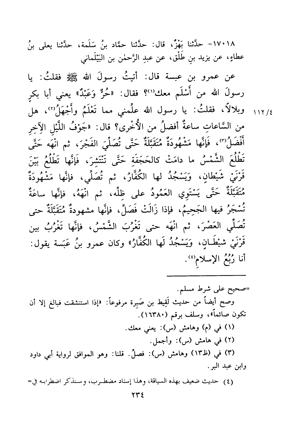 فَقُلْتُ: يَا رَسُولَ اللهِ عَلِّمْنِي مِمَّا تَعْلَمُ وَأَجْهَلُ (٢) ، هَلْ مِنَ السَّاعَاتِ سَاعَةٌ أَفْضَلُ مِنَ الْأُخْرَى؟ قَالَ: " جَوْفُ اللَّيْلِ الْآخِرُ أَفْضَلُ (٣) ، فَإِنَّهَا مَشْهُودَةٌ مُتَقَبَّلَةٌ حَتَّى تُصَلِّيَ الْفَجْرَ، ثُمَّ انْهَهُ حَتَّى تَطْلُعَ الشَّمْسُ مَا دَامَتْ كَالْحَجَفَةِ حَتَّى تَنْتَشِرَ، فَإِنَّهَا تَطْلُعُ بَيْنَ قَرْنَيْ شَيْطَانٍ، وَيَسْجُدُ لَهَا الْكُفَّارُ، ثُمَّ تُصَلِّي، فَإِنَّهَا مَشْهُودَةٌ مُتَقَبَّلَةٌ حَتَّى يَسْتَوِيَ الْعَمُودُ عَلَى ظِلِّهِ، ثُمَّ انْهَهُ، فَإِنَّهَا سَاعَةٌ تُسْجَرُ فِيهَا الْجَحِيمُ، فَإِذَا زَالَتْ فَصَلِّ، فَإِنَّهَا مَشْهُودَةٌ مُتَقَبَّلَةٌ حَتَّى تُصَلِّيَ الْعَصْرَ، ثُمَّ انْهَهُ حَتَّى تَغْرُبَ الشَّمْسُ، فَإِنَّهَا تَغْرُبُ بَيْنَ قَرْنَيْ شَيْطَانٍ، وَيَسْجُدُ لَهَا الْكُفَّارُ " وَكَانَ عَمْرُو بْنُ عَبَسَةَ، يَقُولُ: " أَنَا رُبُعُ الْإِسْلَامِ " " (٤)
