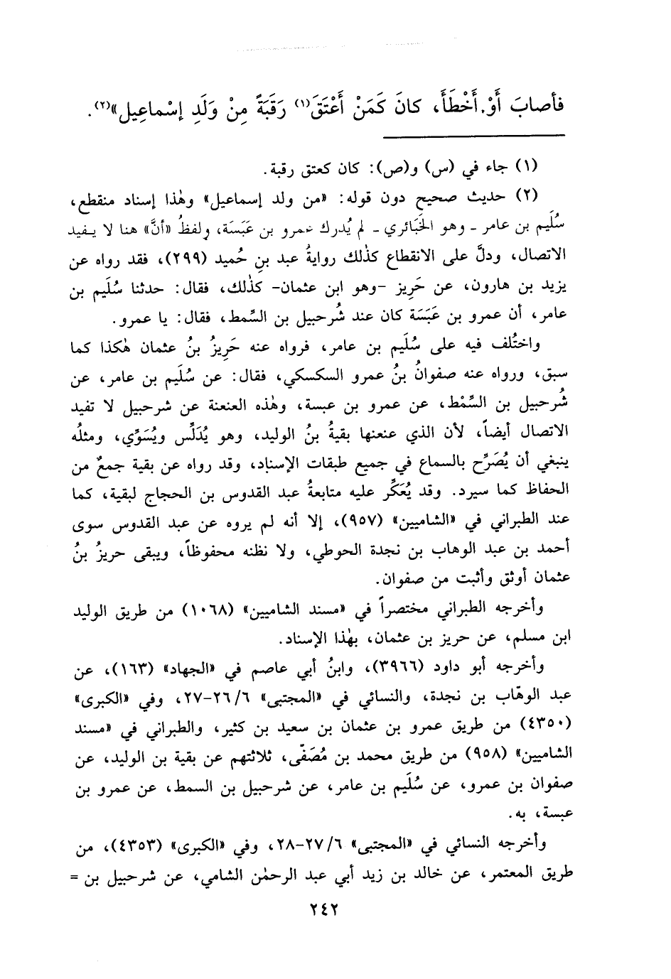 (٢) حديث صحيح دون قوله: "من ولد إسماعيل" وهذا إسناد منقطع، سُلَيم بن عامر- وهو الخَبَائري- لم يُدرك عمرو بن عَبَسَة، ولفظُ "أنَّ" هنا لا يفيد الاتصال، ودلَّ على الانقطاع كذلك رواية عبد بنِ حُميد (٢٩٩) ، فقد رواه عن يزيد بن هارون، عن حَرِيز- وهو ابن عثمان- كذلك، فقال: حدثنا سُلَيم بن عامر، أن عمرو بن عَبَسَة كان عند شُرحبيل بن السِّمط، فقال: يا عمرو.