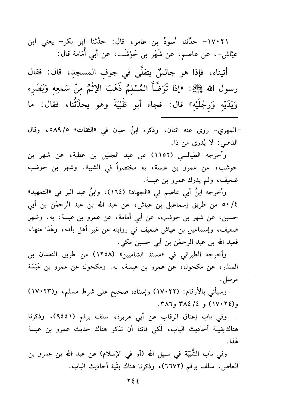 ١٧٠٢١ - حَدَّثَنَا أَسْوَدُ بْنُ عَامِرٍ، قَالَ: حَدَّثَنَا أَبُو بَكْرٍ يَعْنِي ابْنَ عَيَّاشٍ، عَنْ عَاصِمٍ، عَنْ شَهْرِ بْنِ حَوْشَبٍ، عَنْ أَبِي أُمَامَةَ، قَالَ: أَتَيْنَاهُ، فَإِذَا هُوَ جَالِسٌ يَتَفَلَّى فِي جَوْفِ الْمَسْجِدِ، قَالَ: فَقَالَ رَسُولُ اللهِ صَلَّى اللهُ عَلَيْهِ وَسَلَّمَ: " إِذَا تَوَضَّأَ الْمُسْلِمُ ذَهَبَ الْإِثْمُ مِنْ سَمْعِهِ، وَبَصَرِهِ وَيَدَيْهِ وَرِجْلَيْهِ "