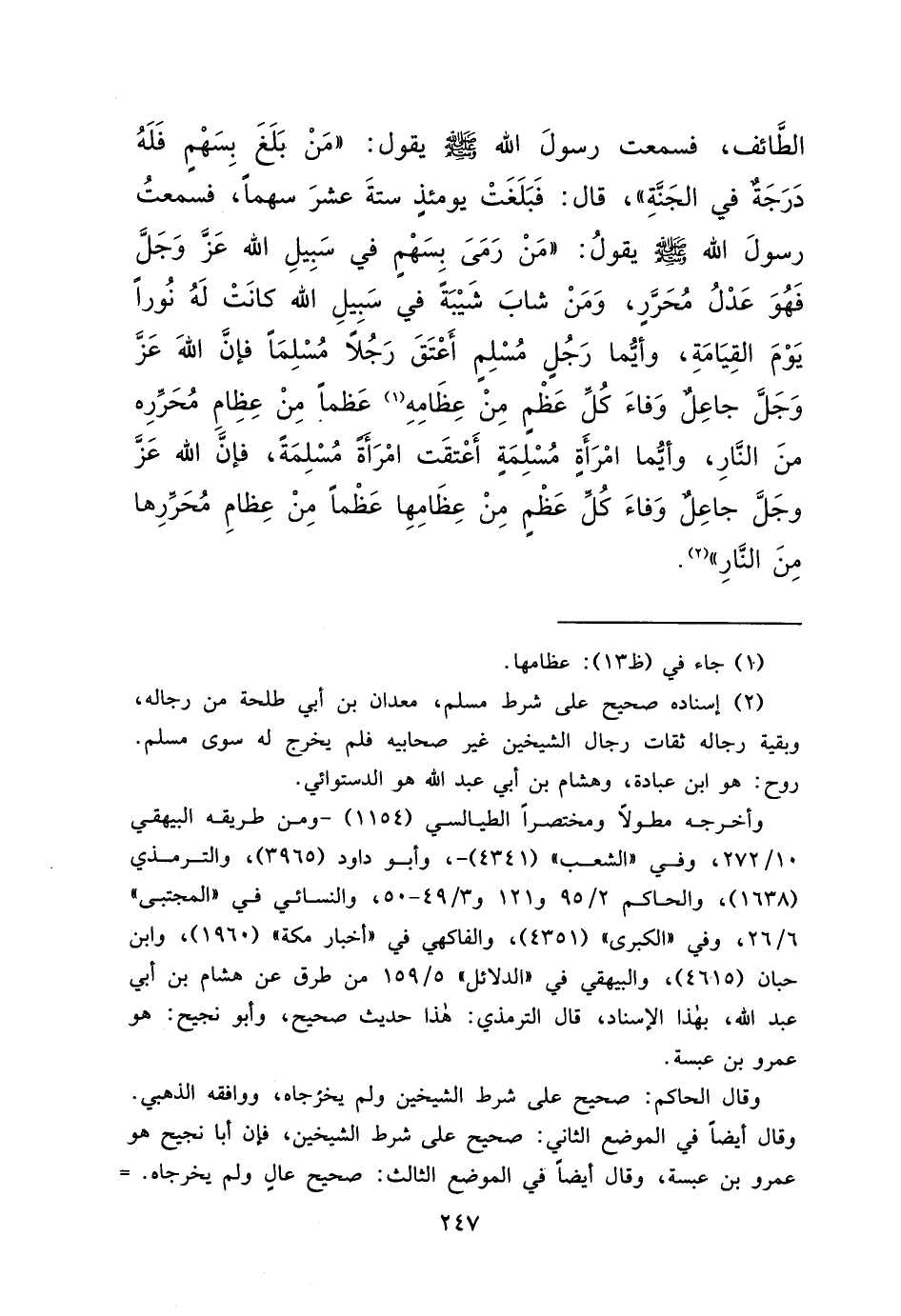 فَسَمِعْتُ رَسُولَ اللهِ صَلَّى اللهُ عَلَيْهِ وَسَلَّمَ يَقُولُ: " مَنْ رَمَى بِسَهْمٍ فِي سَبِيلِ اللهِ عَزَّ وَجَلَّ فَهُوَ عِدْلُ مُحَرَّرٍ، وَمَنْ شَابَ شَيْبَةً فِي سَبِيلِ اللهِ كَانَتْ لَهُ نُورًا يَوْمَ الْقِيَامَةِ، وَأَيُّمَا رَجُلٍ مُسْلِمٍ أَعْتَقَ رَجُلًا مُسْلِمًا فَإِنَّ اللهَ عَزَّ وَجَلَّ جَاعِلٌ وَفَاءَ كُلِّ عَظْمٍ مِنْ عِظَامِهِ (١) عَظْمًا مِنْ عِظَامِ مُحَرَّرِهِ مِنَ النَّارِ، وَأَيُّمَا امْرَأَةٍ مُسْلِمَةٍ أَعْتَقَتْ امْرَأَةً مُسْلِمَةً، فَإِنَّ اللهَ عَزَّ وَجَلَّ جَاعِلٌ وَفَاءَ كُلِّ عَظْمٍ مِنْ عِظَامِهَا عَظْمًا مِنْ عِظَامِ مُحَرَّرِهَا مِنَ النَّارِ " (٢)