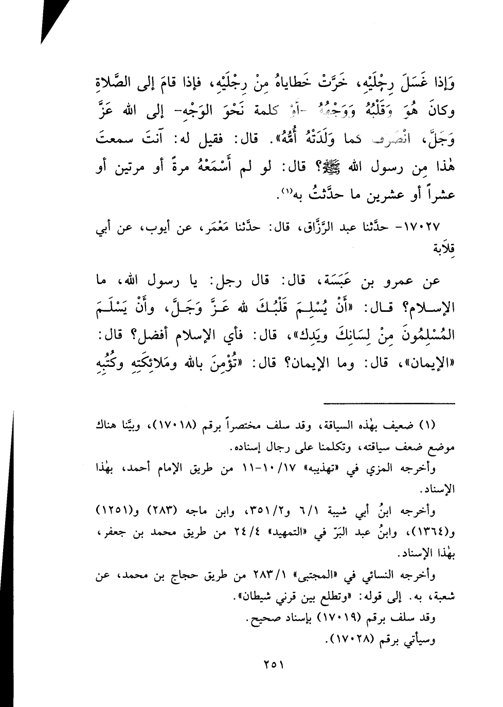 ١٧٠٢٧ - حَدَّثَنَا عَبْدُ الرَّزَّاقِ، قَالَ: حَدَّثَنَا مَعْمَرٌ، عَنْ أَيُّوبَ، عَنْ أَبِي قِلَابَةَ، عَنْ عَمْرِو بْنِ عَبَسَةَ، قَالَ: قَالَ رَجُلٌ: يَا رَسُولَ اللهِ، مَا الْإِسْلَامُ؟ قَالَ: " أَنْ يُسْلِمَ قَلْبُكَ لِلَّهِ عَزَّ وَجَلَّ، وَأَنْ يَسْلَمَ الْمُسْلِمُونَ مِنْ لِسَانِكَ وَيَدِكَ "، قَالَ: فَأَيُّ الْإِسْلَامِ أَفْضَلُ؟ قَالَ: " الْإِيمَانُ "، قَالَ: وَمَا الْإِيمَانُ؟ قَالَ: " تُؤْمِنُ بِاللهِ وَمَلَائِكَتِهِ وَكُتُبِهِ