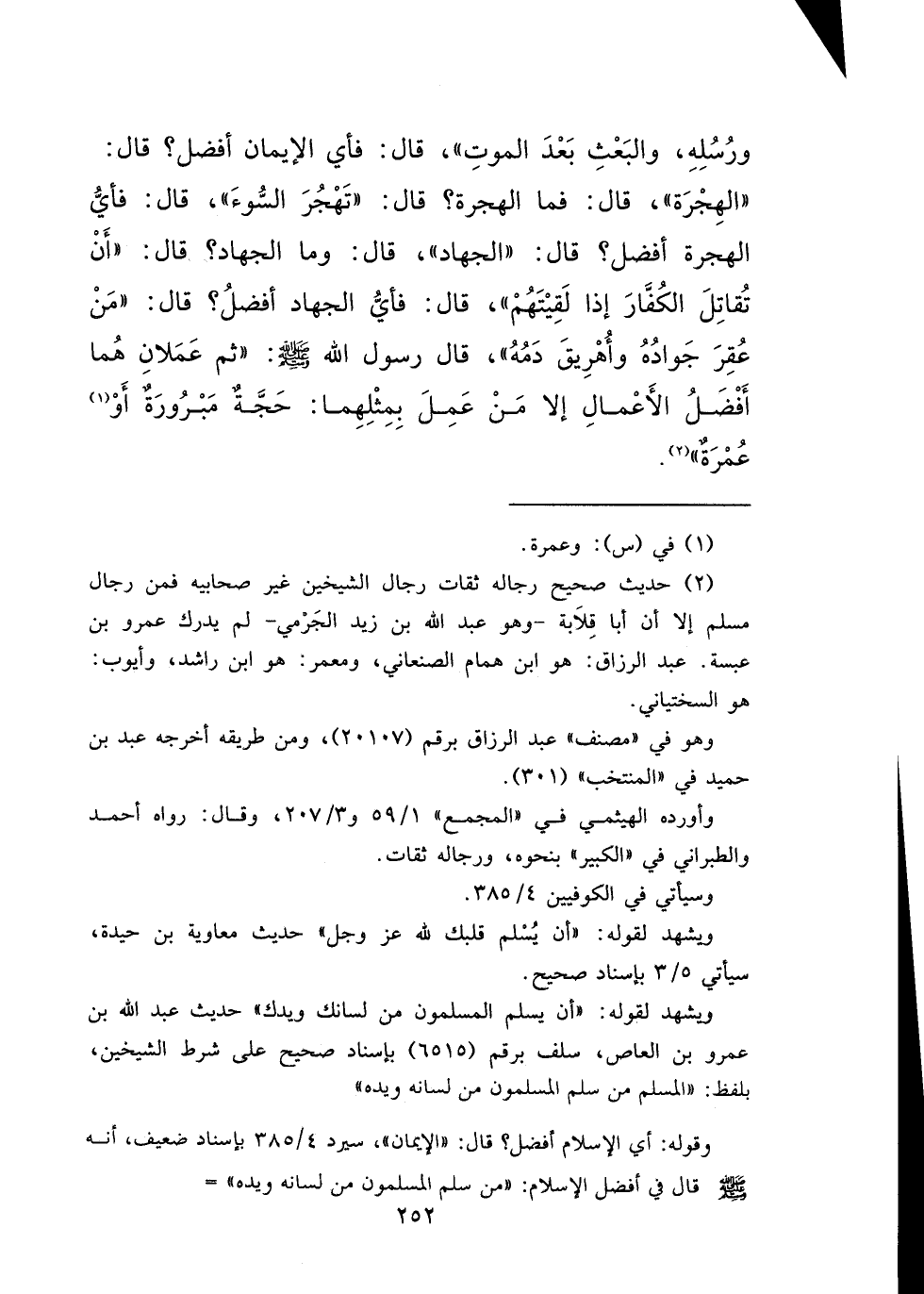 وَرُسُلِهِ، وَالْبَعْثِ بَعْدَ الْمَوْتِ "، قَالَ: فَأَيُّ الْإِيمَانِ أَفْضَلُ؟ قَالَ: " الْهِجْرَةُ "، قَالَ: فَمَا الْهِجْرَةُ؟ قَالَ: " تَهْجُرُ السُّوءَ "، قَالَ: فَأَيُّ الْهِجْرَةِ أَفْضَلُ؟ قَالَ: " الْجِهَادُ "، قَالَ: وَمَا الْجِهَادُ؟ قَالَ: " أَنْ تُقَاتِلَ الْكُفَّارَ إِذَا لَقِيتَهُمْ "، قَالَ: فَأَيُّ الْجِهَادِ أَفْضَلُ؟ قَالَ: " مَنْ عُقِرَ جَوَادُهُ وَأُهْرِيقَ دَمُهُ "، قَالَ رَسُولُ اللهِ صَلَّى اللهُ عَلَيْهِ وَسَلَّمَ: " ثُمَّ عَمَلَانِ هُمَا أَفْضَلُ الْأَعْمَالِ إِلَّا مَنْ عَمِلَ بِمِثْلِهِمَا: حَجَّةٌ مَبْرُورَةٌ أَوْ (١) عُمْرَةٌ " (٢)