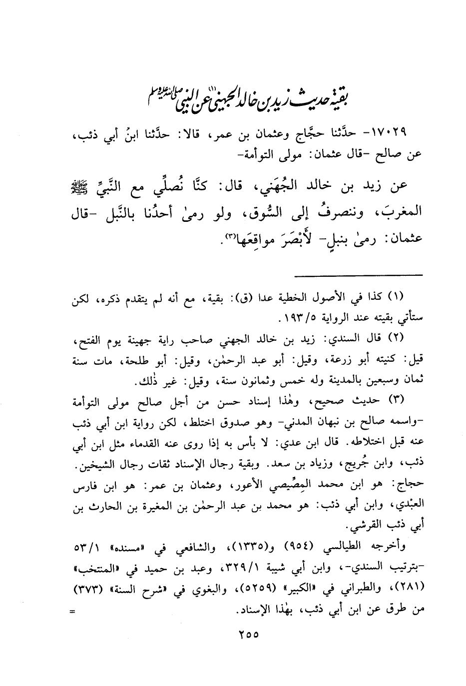 ١٧٠٢٩ - حَدَّثَنَا حَجَّاجٌ، وَعُثْمَانُ بْنُ عُمَرَ، قَالَا: حَدَّثَنَا ابْنُ أَبِي ذِئْبٍ، عَنْ صَالِحٍ، قَالَ عُثْمَانُ مَوْلَى التَّوْأَمَةِ: عَنْ زَيْدِ بْنِ خَالِدٍ الْجُهَنِيِّ