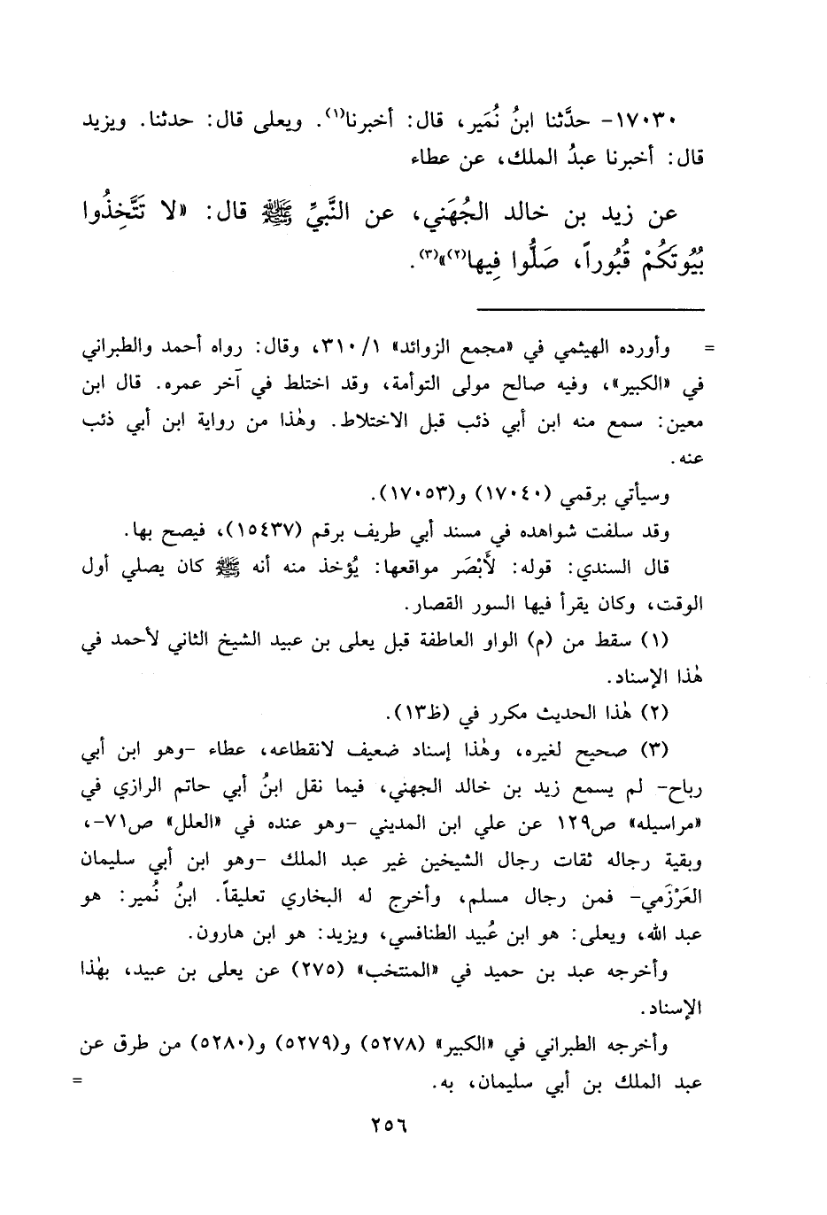 ١٧٠٣٠ - حَدَّثَنَا ابْنُ نُمَيْرٍ، قَالَ: أَخْبَرَنَا (١) وَيَعْلَى قَالَ: حَدَّثَنَا وَيَزِيدُ، قَالَ: أَخْبَرَنَا عَبْدُ الْمَلِكِ، عَنْ عَطَاءٍ، عَنْ زَيْدِ بْنِ خَالِدٍ الْجُهَنِيِّ، عَنِ النَّبِيِّ صَلَّى اللهُ عَلَيْهِ وَسَلَّمَ قَالَ: " لَا تَتَّخِذُوا بُيُوتَكُمْ قُبُورًا، صَلُّوا فِيهَا (٢) " (٣)