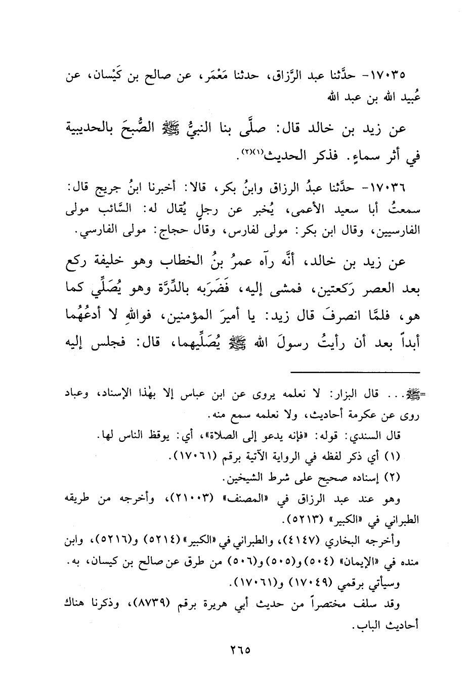 ١٧٠٣٥ - حَدَّثَنَا عَبْدُ الرَّزَّاقِ، حَدَّثَنَا مَعْمَرٌ، عَنْ صَالِحِ بْنِ كَيْسَانَ، عَنْ عُبَيْدِ اللهِ بْنِ عَبْدِ اللهِ، عَنْ زَيْدِ بْنِ خَالِدٍ، قَالَ: " صَلَّى بِنَا النَّبِيُّ صَلَّى اللهُ عَلَيْهِ وَسَلَّمَ الصُّبْحَ بِالْحُدَيْبِيَةِ فِي أَثَرِ سَمَاءٍ " فَذَكَرَ الْحَدِيثَ (١) (٢)