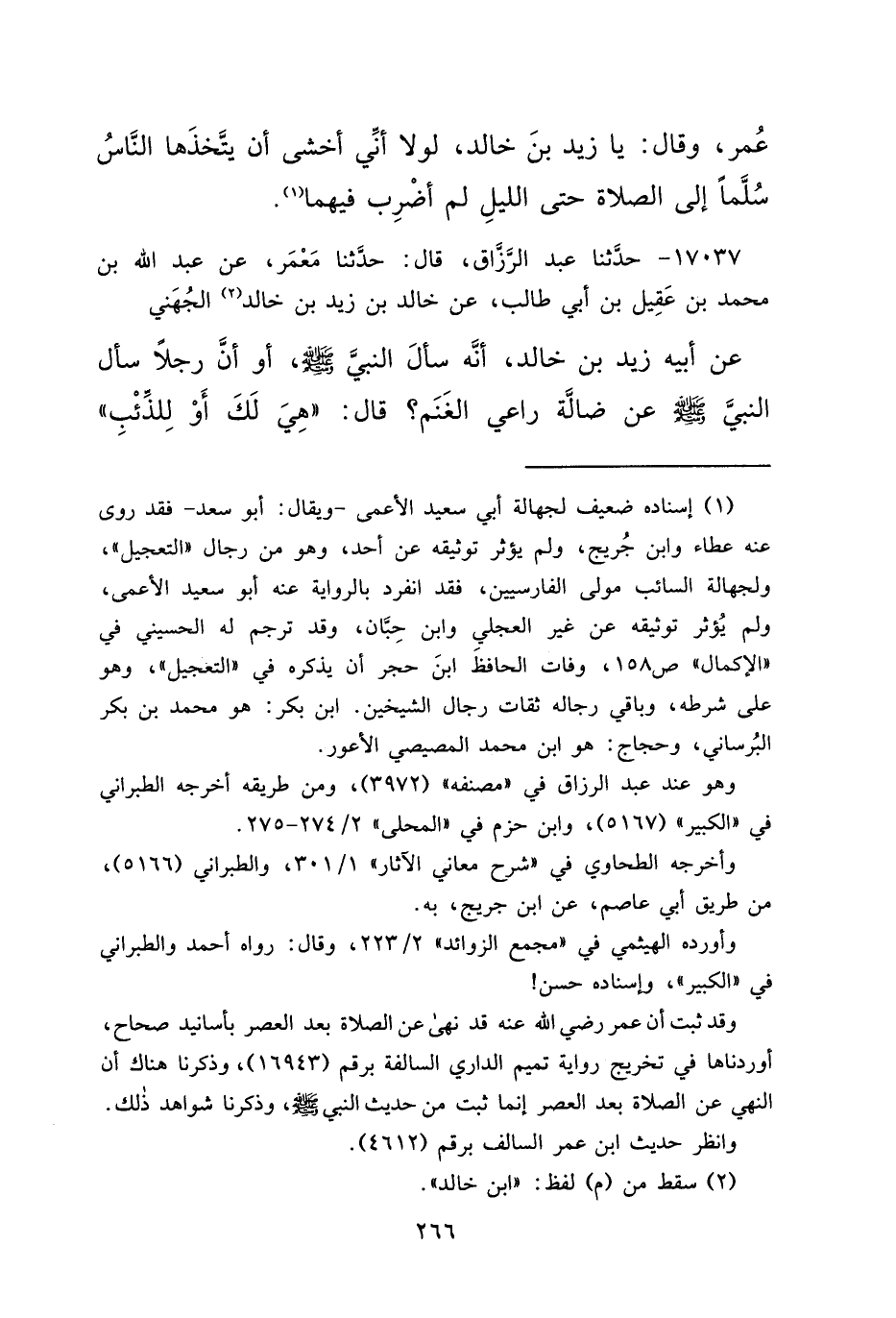 عُمَرُ، وَقَالَ: " يَا زَيْدُ بْنَ خَالِدٍ، لَوْلَا أَنِّي أَخْشَى أَنْ يَتَّخِذَهَا النَّاسُ سُلَّمًا إِلَى الصَّلَاةِ حَتَّى اللَّيْلِ لَمْ أَضْرِبْ فِيهِمَا " (١)
