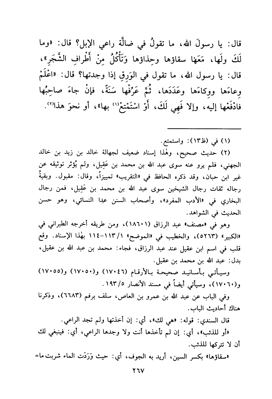 قَالَ: يَا رَسُولَ اللهِ، مَا تَقُولُ فِي ضَالَّةِ رَاعِي الْإِبِلِ؟ قَالَ: " وَمَا لَكَ وَلَهَا، مَعَهَا سِقَاؤُهَا وَحِذَاؤُهَا وَتَأْكُلُ مِنْ أَطْرَافِ الشَّجَرِ "، قَالَ: يَا رَسُولَ اللهِ، مَا تَقُولُ فِي الْوَرِقِ إِذَا وَجَدْتُهَا؟ قَالَ: " اعْلَمْ وِعَاءَهَا وَوِكَاءَهَا وَعَدَدَهَا، ثُمَّ عَرِّفْهَا سَنَةً، فَإِنْ جَاءَ صَاحِبُهَا فَادْفَعْهَا إِلَيْهِ، وَإِلَّا فَهِيَ لَكَ، أَوْ اسْتَمْتِعْ (١) بِهَا "، أَوْ نَحْوَ هَذَا (٢)