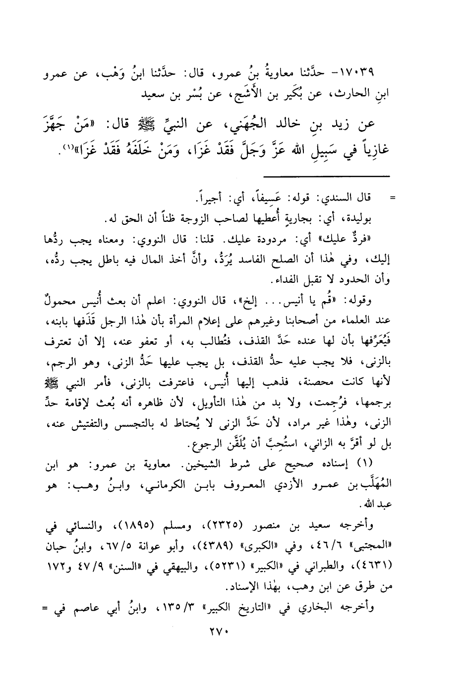 ١٧٠٣٩ - حَدَّثَنَا مُعَاوِيَةُ بْنُ عَمْرٍو، قَالَ: حَدَّثَنَا ابْنُ وَهْبٍ، عَنْ عَمْرِو بْنِ الْحَارِثِ، عَنْ بُكَيْرِ بْنِ الْأَشَجِّ، عَنْ بُسْرِ بْنِ سَعِيدٍ، عَنْ زَيْدِ بْنِ خَالِدٍ الْجُهَنِيِّ، عَنِ النَّبِيِّ صَلَّى اللهُ عَلَيْهِ وَسَلَّمَ قَالَ: " مَنْ جَهَّزَ غَازِيًا فِي سَبِيلِ اللهِ عَزَّ وَجَلَّ فَقَدْ غَزَا، وَمَنْ خَلَفَهُ فَقَدْ غَزَا " (١)