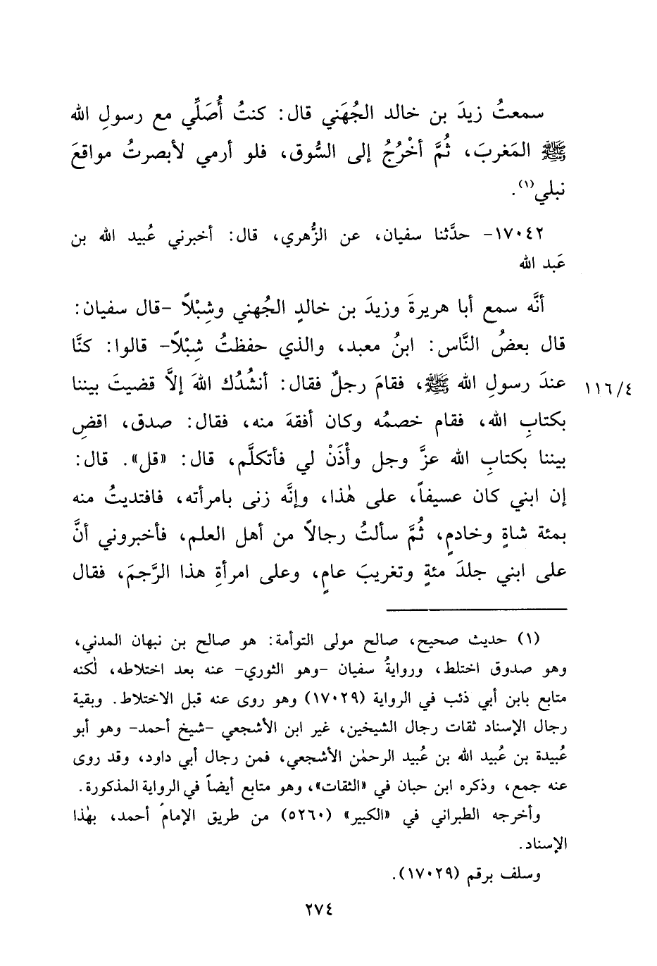 ١٧٠٤٢ - حَدَّثَنَا سُفْيَانُ، عَنِ الزُّهْرِيِّ، قَالَ: أَخْبَرَنِي عُبَيْدُ اللهِ بْنُ عَبْدِ اللهِ، أَنَّهُ سَمِعَ أَبَا هُرَيْرَةَ، وَزَيْدَ بْنَ خَالِدٍ الْجُهَنِيَّ، وَشَبْلًا - قَالَ سُفْيَانُ: قَالَ بَعْضُ النَّاسِ: ابْنَ مَعْبَدٍ، وَالَّذِي حَفِظْتُ شِبْلًا -، قَالُوا: كُنَّا عِنْدَ رَسُولِ اللهِ صَلَّى اللهُ عَلَيْهِ وَسَلَّمَ، فَقَامَ رَجُلٌ فَقَالَ: أَنْشُدُكَ اللهَ إِلَّا قَضَيْتَ بَيْنَنَا بِكِتَابِ اللهِ، فَقَامَ خَصْمُهُ وَكَانَ أَفْقَهَ مِنْهُ، فَقَالَ: صَدَقَ، اقْضِ بَيْنَنَا بِكِتَابِ اللهِ عَزَّ وَجَلَّ وَأْذَنْ لِي فَأَتَكَلَّمَ، قَالَ: " قُلْ ". قَالَ: إِنَّ ابْنِي كَانَ عَسِيفًا، عَلَى هَذَا، وَإِنَّهُ زَنَى بِامْرَأَتِهِ، فَافْتَدَيْتُ مِنْهُ بِمِائَةِ شَاةٍ وَخَادِمٍ، ثُمَّ سَأَلْتُ رِجَالًا مِنْ أَهْلِ الْعِلْمِ، فَأَخْبَرُونِي أَنَّ عَلَى ابْنِي جَلْدَ مِائَةٍ وَتَغْرِيبَ عَامٍ، وَعَلَى امْرَأَةِ هَذَا الرَّجْمَ، فَقَالَ