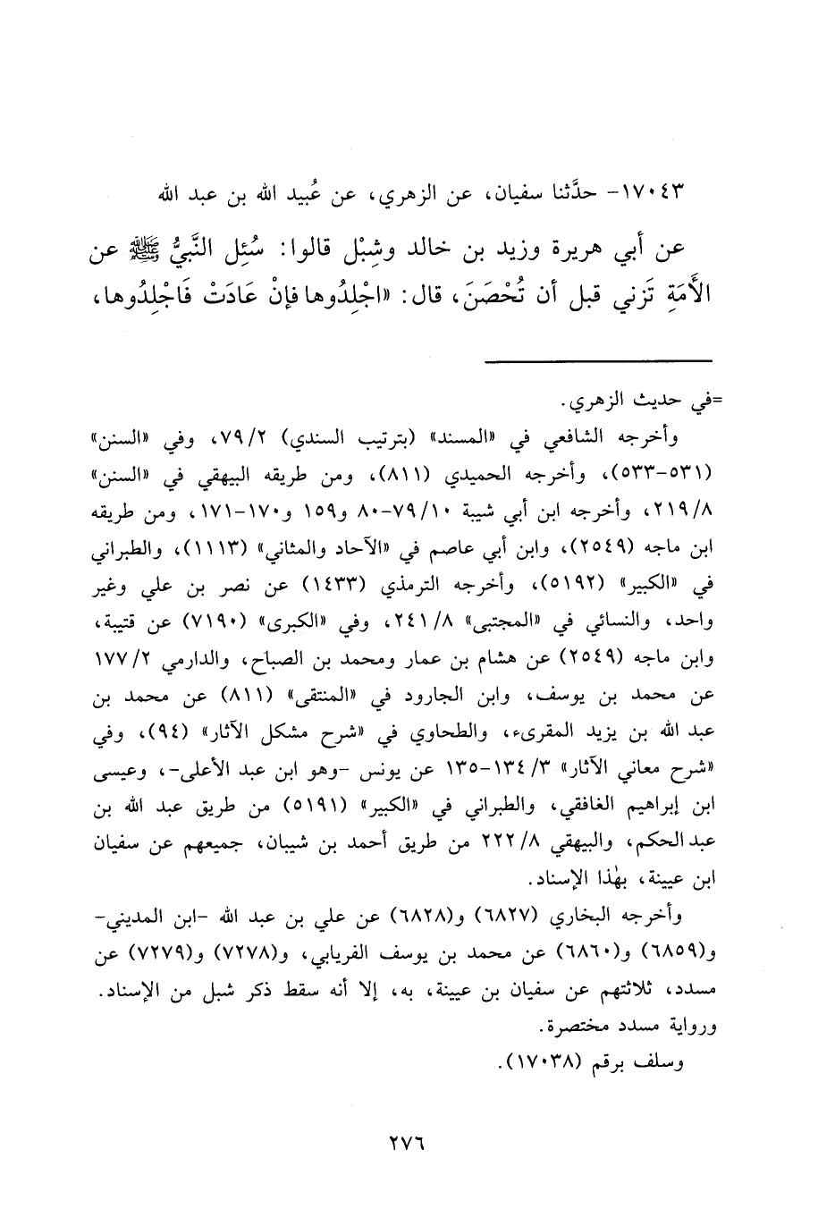 ١٧٠٤٣ - حَدَّثَنَا سُفْيَانُ، عَنِ الزُّهْرِيِّ، عَنْ عُبَيْدِ اللهِ بْنِ عَبْدِ اللهِ، عَنْ أَبِي هُرَيْرَةَ، وَزَيْدِ بْنِ خَالِدٍ، وَشَبْلٍ، قَالُوا: سُئِلَ النَّبِيُّ صَلَّى اللهُ عَلَيْهِ وَسَلَّمَ عَنْ الْأَمَةِ تَزْنِي قَبْلَ أَنْ تُحْصَنَ، قَالَ: " اجْلِدُوهَا فَإِنْ عَادَتْ فَاجْلِدُوهَا،