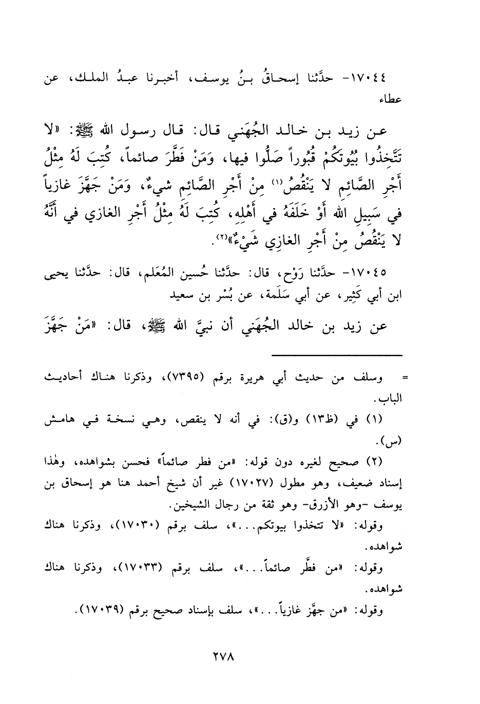 ١٧٠٤٥ - حَدَّثَنَا رَوْحٌ، قَالَ: حَدَّثَنَا حُسَيْنٌ الْمُعَلِّمُ، قَالَ: حَدَّثَنَا يَحْيَى بْنُ أَبِي كَثِيرٍ، عَنْ أَبِي سَلَمَةَ، عَنْ بُسْرِ بْنِ سَعِيدٍ، عَنْ زَيْدِ بْنِ خَالِدٍ الْجُهَنِيِّ، أَنَّ نَبِيَّ اللهِ صَلَّى اللهُ عَلَيْهِ وَسَلَّمَ قَالَ: " مَنْ جَهَّزَ