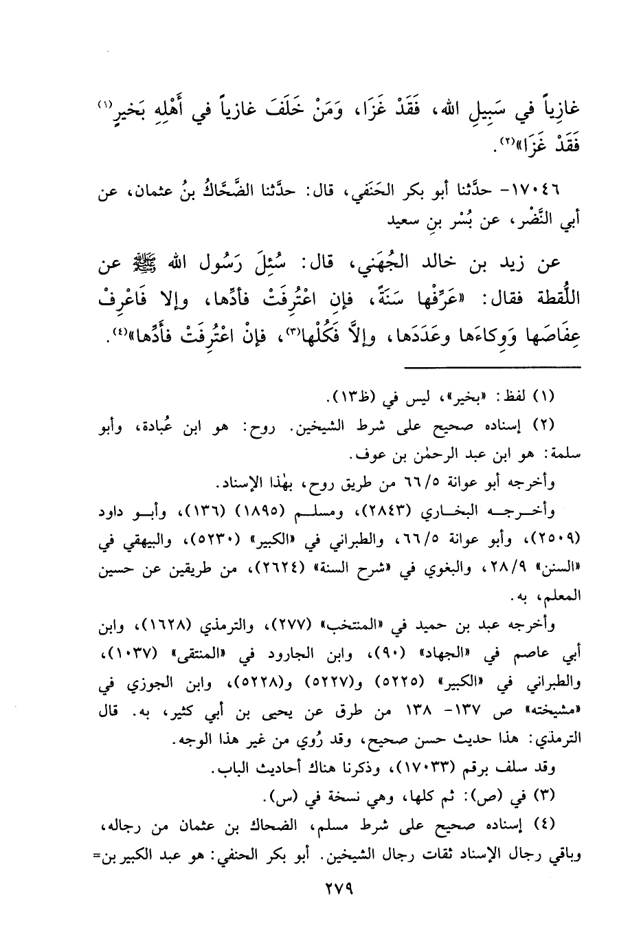 ١٧٠٤٦ - حَدَّثَنَا أَبُو بَكْرٍ الْحَنَفِيُّ، قَالَ: حَدَّثَنَا الضَّحَّاكُ بْنُ عُثْمَانَ، عَنْ أَبِي النَّضْرِ، عَنْ بُسْرِ بْنِ سَعِيدٍ، عَنْ زَيْدِ بْنِ خَالِدٍ الْجُهَنِيِّ، قَالَ: سُئِلَ رَسُولُ اللهِ صَلَّى اللهُ عَلَيْهِ وَسَلَّمَ عَنِ اللُّقَطَةِ؟ فَقَالَ: " عَرِّفْهَا سَنَةً، فَإِنْ اعْتُرِفَتْ فَأَدِّهَا، وَإِلَّا فَاعْرِفْ عِفَاصَهَا وَوِكَاءَهَا وَعَدَدَهَا، وَإِلَّا فَكُلْهَا (٣) ، فَإِنْ اعْتُرِفَتْ فَأَدِّهَا " (٤)