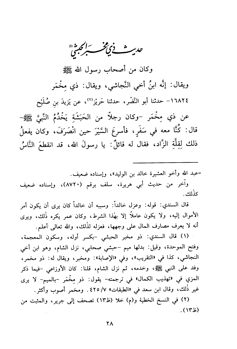 ١٦٨٢٤ - حَدَّثَنَا أَبُو النَّضْرِ، حَدَّثَنَا حَرِيزٌ (٢) ، عَنْ يَزِيدَ بْنِ صُلَيْحٍ، عَنْ ذِي مِخْمَرٍ - وَكَانَ رَجُلًا مِنَ الْحَبَشَةِ يَخْدُمُ النَّبِيَّ صَلَّى اللهُ عَلَيْهِ وَسَلَّمَ -، قَالَ: كُنَّا مَعَهُ فِي سَفَرٍ، فَأَسْرَعَ السَّيْرَ حِينَ انْصَرَفَ، وَكَانَ يَفْعَلُ ذَلِكَ لِقِلَّةِ الزَّادِ، فَقَالَ لَهُ قَائِلٌ: يَا رَسُولَ اللهِ، قَدِ انْقَطَعَ النَّاسُ