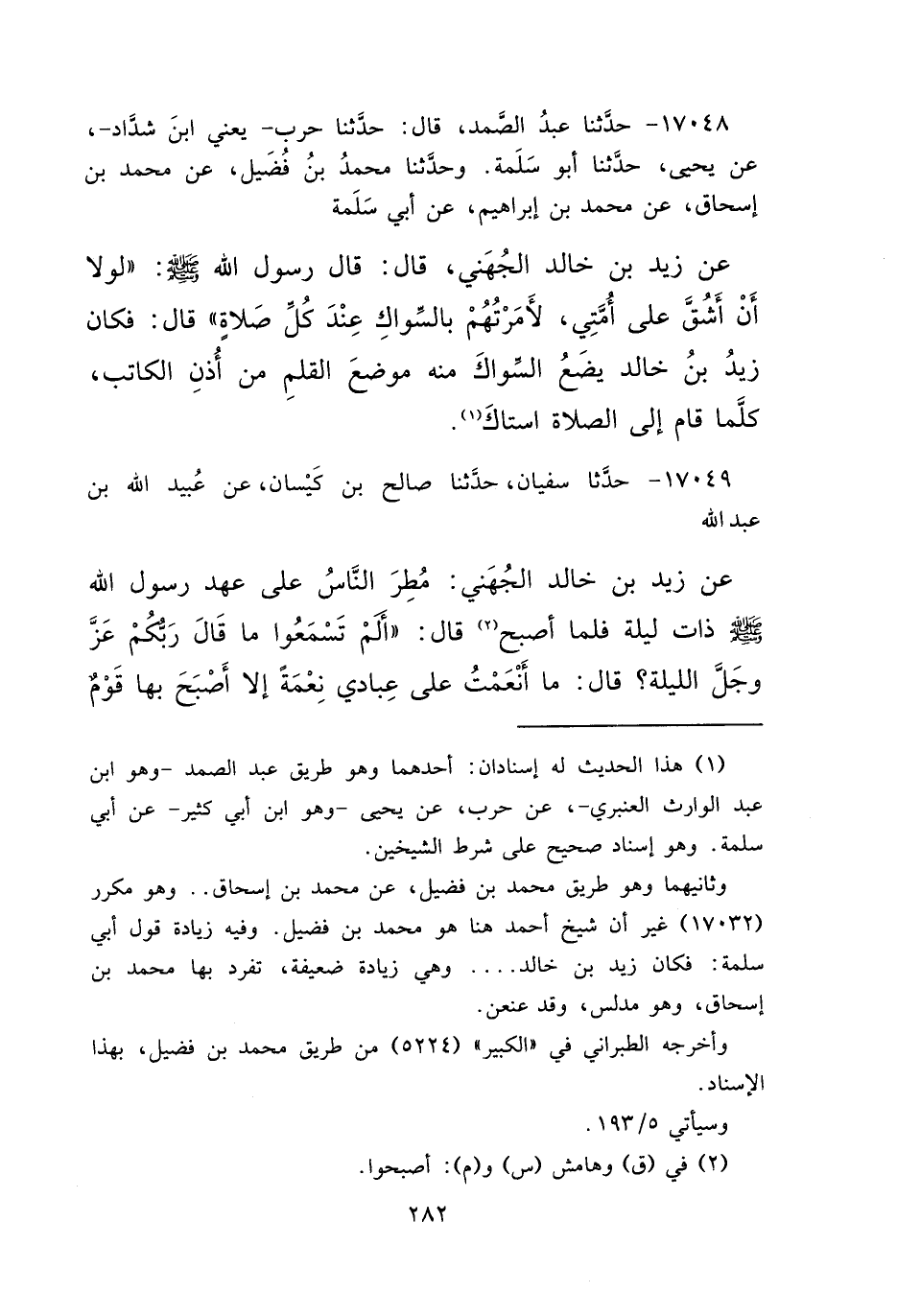 ١٧٠٤٨ - حَدَّثَنَا عَبْدُ الصَّمَدِ، قَالَ: حَدَّثَنَا حَرْبٌ يَعْنِي ابْنَ شَدَّادٍ، عَنْ يَحْيَى، حَدَّثَنَا أَبُو سَلَمَةَ، وَحَدَّثَنَا مُحَمَّدُ بْنُ فُضَيْلٍ، عَنْ مُحَمَّدِ بْنِ إِسْحَاقَ، عَنْ مُحَمَّدِ بْنِ إِبْرَاهِيمَ، عَنْ أَبِي سَلَمَةَ، عَنْ زَيْدِ بْنِ خَالِدٍ الْجُهَنِيِّ، قَالَ: قَالَ رَسُولُ اللهِ صَلَّى اللهُ عَلَيْهِ وَسَلَّمَ: " لَوْلَا أَنْ أَشُقَّ عَلَى أُمَّتِي، لَأَمَرْتُهُمْ بِالسِّوَاكِ عِنْدَ كُلِّ صَلَاةٍ " قَالَ: " فَكَانَ زَيْدُ بْنُ خَالِدٍ، يَضَعُ السِّوَاكَ مِنْهُ مَوْضِعَ الْقَلَمِ مِنْ أُذُنِ الْكَاتِبِ، كُلَّمَا قَامَ إِلَى الصَّلَاةِ اسْتَاكَ " (١)