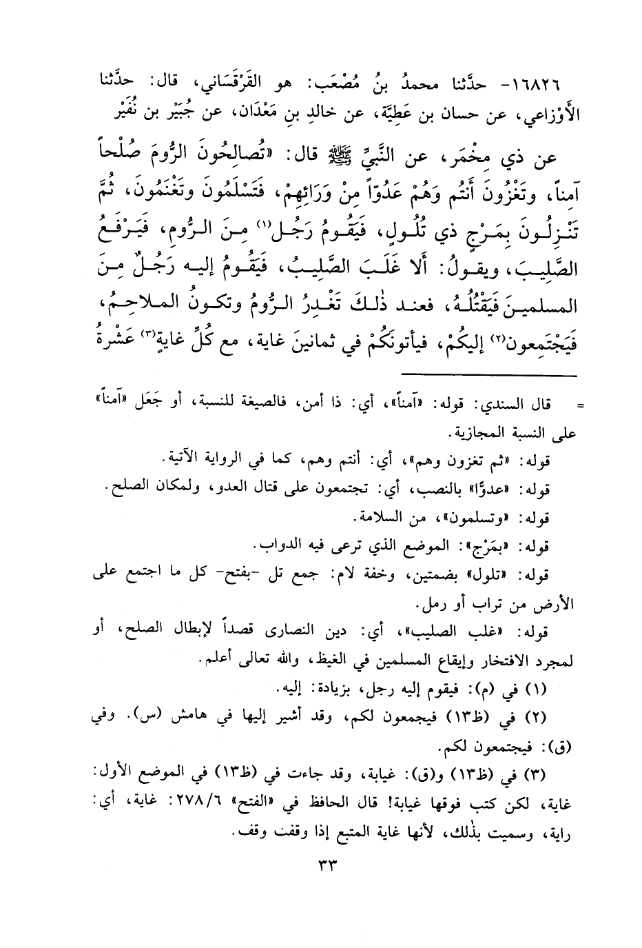 ١٦٨٢٦ - حَدَّثَنَا مُحَمَّدُ بْنُ مُصْعَبٍ هُوَ الْقُرْقُسَانِيُّ، قَالَ: حَدَّثَنَا الْأَوْزَاعِيُّ، عَنْ حَسَّانَ بْنِ عَطِيَّةَ، عَنْ خَالِدِ بْنِ مَعْدَانَ، عَنْ جُبَيْرِ بْنِ نُفَيْرٍ، عَنْ ذِي مِخْمَرٍ، عَنِ النَّبِيِّ صَلَّى اللهُ عَلَيْهِ وَسَلَّمَ قَالَ: " تُصَالِحُونَ الرُّومَ صُلْحًا آمِنًا، وَتَغْزُونَ أَنْتُمْ وَهُمْ عَدُوًّا مِنْ وَرَائِهِمْ، فَتَسْلَمُونَ وَتَغْنَمُونَ، ثُمَّ تَنْزِلُونَ بِمَرْجٍ ذِي تُلُولٍ، فَيَقُومُ رَجُلٌ (١) مِنَ الرُّومِ، فَيَرْفَعُ الصَّلِيبَ، وَيَقُولُ: أَلَا غَلَبَ الصَّلِيبُ، فَيَقُومُ إِلَيْهِ رَجُلٌ مِنَ الْمُسْلِمِينَ فَيَقْتُلُهُ، فَعِنْدَ ذَلِكَ تَغْدِرُ الرُّومُ وَتَكُونُ الْمَلَاحِمُ، فَيَجْتَمِعُونَ (٢) إِلَيْكُمْ، فَيَأْتُونَكُمْ فِي ثَمَانِينَ غَايَةً، مَعَ كُلِّ غَايَةٍ عَشْرَةُ (٣)