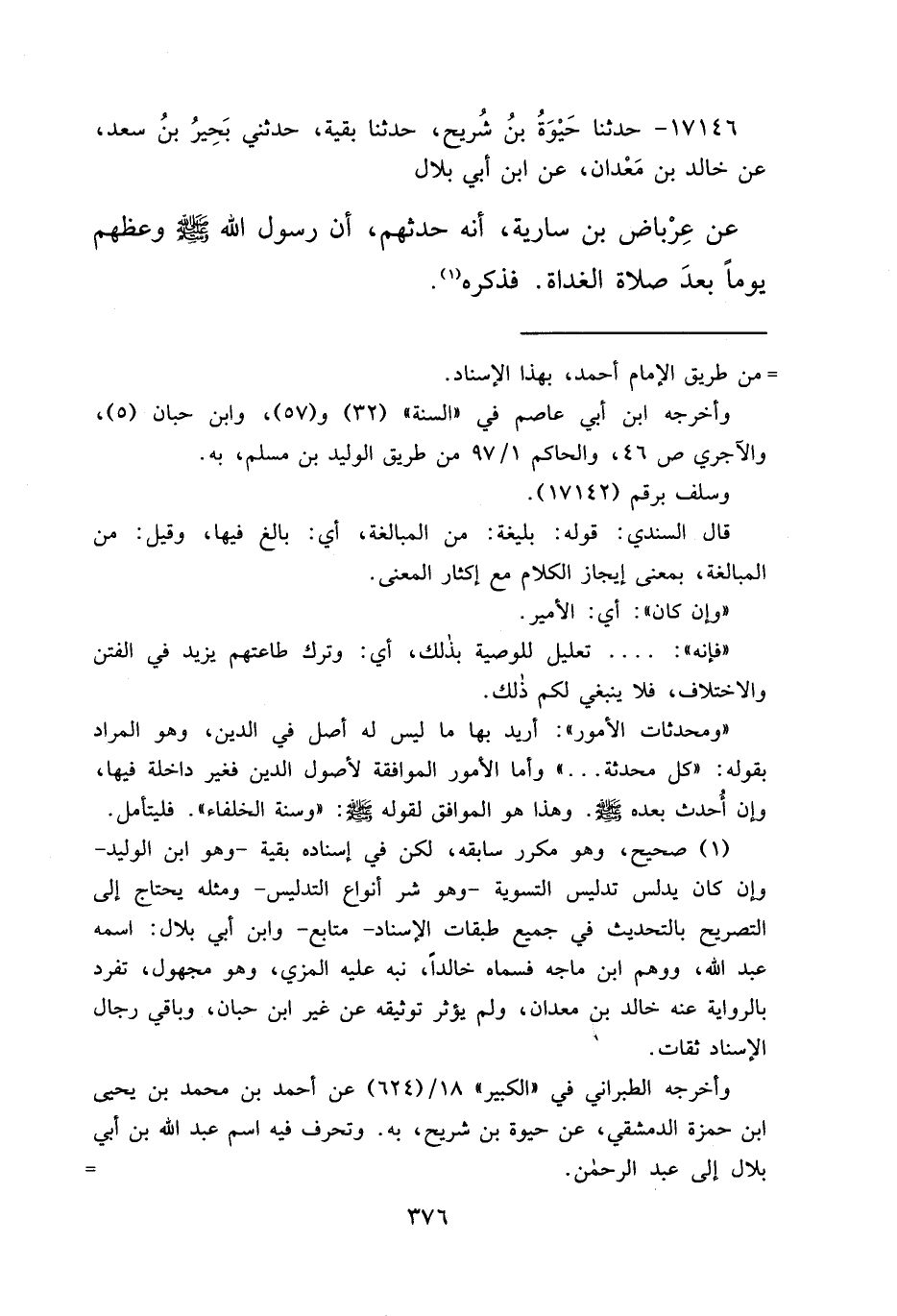 ١٧١٤٦ - حَدَّثَنَا حَيْوَةُ بْنُ شُرَيْحٍ، حَدَّثَنَا بَقِيَّةُ، حَدَّثَنِي بَحِيرُ بْنُ سَعْدٍ، عَنْ خَالِدِ بْنِ مَعْدَانَ، عَنِ ابْنِ أَبِي بِلَالٍ، عَنْ عِرْبَاضِ بْنِ سَارِيَةَ، أَنَّهُ حَدَّثَهُمْ أَنَّ رَسُولَ اللهِ صَلَّى اللهُ عَلَيْهِ وَسَلَّمَ وَعَظَهُمْ يَوْمًا بَعْدَ صَلَاةِ الْغَدَاةِ، فَذَكَرَهُ (١) ،