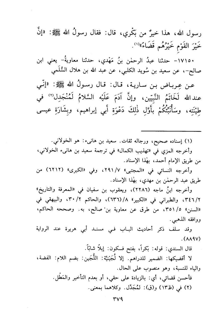 ١٧١٥٠ - حَدَّثَنَا عَبْدُ الرَّحْمَنِ بْنُ مَهْدِيٍّ، حَدَّثَنَا مُعَاوِيَةُ يَعْنِي ابْنَ صَالِحٍ، عَنْ سَعِيدِ بْنِ سُوَيْدٍ الْكَلْبِيِّ، عَنْ عَبْدِ الأَعْلَى بْنِ هِلَالٍ السُّلَمِيِّ، عَنْ عِرْبَاضِ بْنِ سَارِيَةَ، قَالَ: قَالَ رَسُولُ اللهِ صَلَّى اللهُ عَلَيْهِ وَسَلَّمَ: " إِنِّي عَبْدُ اللهِ لَخَاتَمُ النَّبِيِّينَ، وَإِنَّ آدَمَ عَلَيْهِ السَّلَامُ لَمُنْجَدِلٌ (٢) فِي طِينَتِهِ، وَسَأُنَبِّئُكُمْ بِأَوَّلِ ذَلِكَ دَعْوَةُ أَبِي إِبْرَاهِيمَ، وَبِشَارَةُ عِيسَى