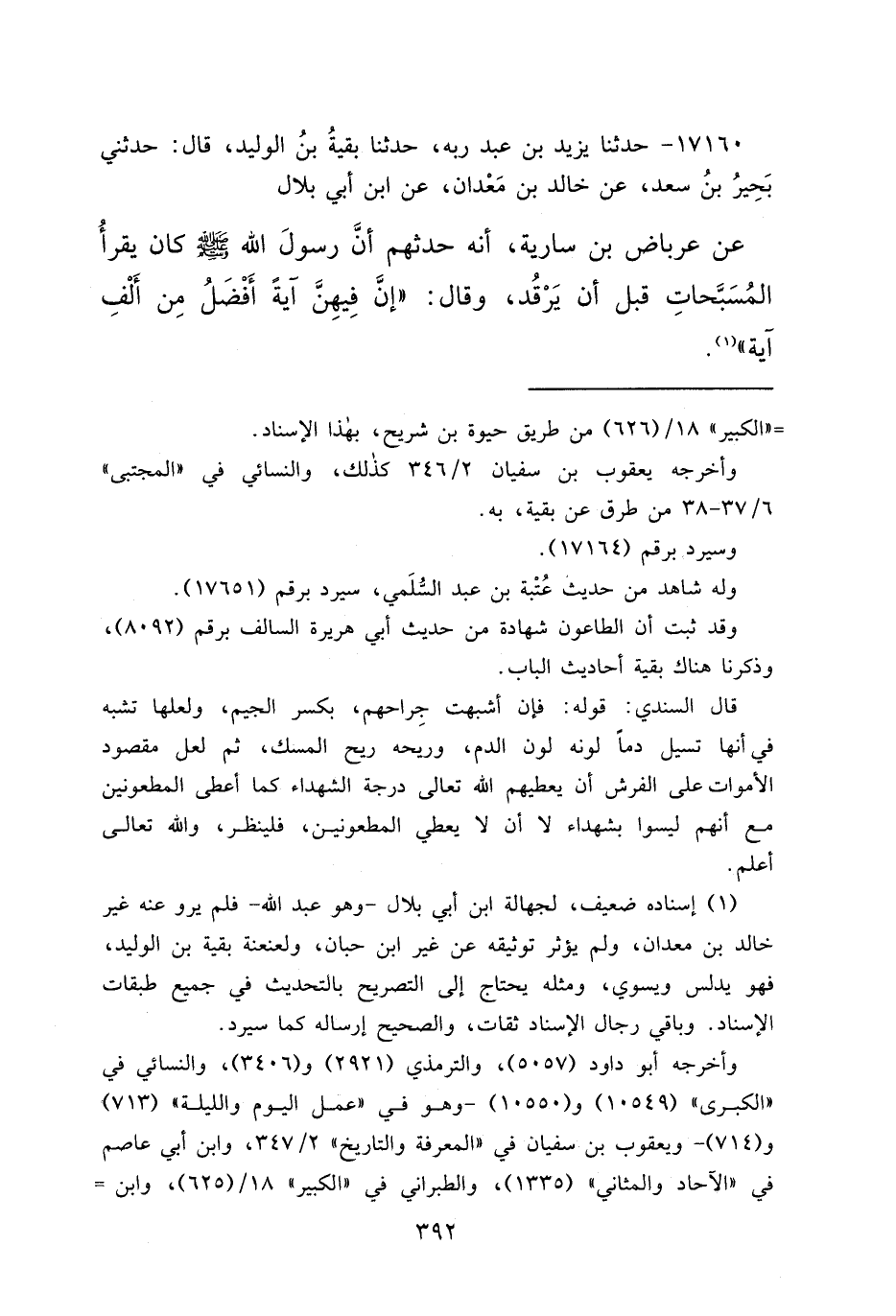 ١٧١٦٠ - حَدَّثَنَا يَزِيدُ بْنُ عَبْدِ رَبِّهِ، حَدَّثَنَا بَقِيَّةُ بْنُ الْوَلِيدِ، قَالَ: حَدَّثَنِي بَحِيرُ بْنُ سَعْدٍ، عَنْ خَالِدِ بْنِ مَعْدَانَ، عَنِ ابْنِ أَبِي بِلَالٍ، عَنْ عِرْبَاضِ بْنِ سَارِيَةَ، أَنَّهُ حَدَّثَهُمْ أَنَّ رَسُولَ اللهِ صَلَّى اللهُ عَلَيْهِ وَسَلَّمَ كَانَ يَقْرَأُ الْمُسَبِّحَاتِ قَبْلَ أَنْ يَرْقُدَ، وَقَالَ: " إِنَّ فِيهِنَّ آيَةً أَفْضَلُ مِنْ أَلْفِ آيَةٍ " (١)