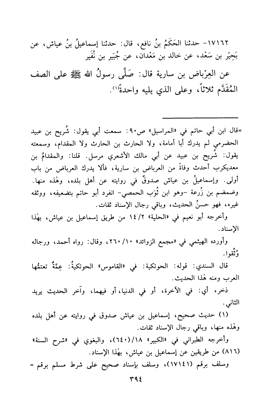 ١٧١٦٢ - حَدَّثَنَا الْحَكَمُ بْنُ نَافِعٍ، قَالَ: حَدَّثَنَا إِسْمَاعِيلُ بْنُ عَيَّاشٍ، عَنْ بَحِيرِ بْنِ سَعْدٍ، عَنْ خَالِدِ بْنِ مَعْدَانَ، عَنْ جُبَيْرِ بْنِ نُفَيْرٍ، عَنِ الْعِرْبَاضِ بْنِ سَارِيَةَ، قَالَ: " صَلَّى رَسُولُ اللهِ صَلَّى اللهُ عَلَيْهِ وَسَلَّمَ عَلَى الصَّفِّ الْمُقَدَّمِ ثَلَاثًا، وَعَلَى الَّذِي يَلِيهِ وَاحِدَةً " (١)