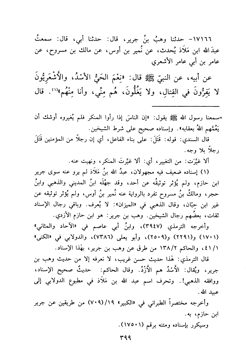 ١٧١٦٦ - حَدَّثَنَا وَهْبُ بْنُ جَرِيرٍ، قَالَ: حَدَّثَنَا أَبِي، قَالَ: سَمِعْتُ عَبْدَ اللهِ بْنَ مَلَاذٍ، يُحَدِّثُ، عَنْ نُمَيْرِ بْنِ أَوْسٍ، عَنْ مَالِكِ بْنِ مَسْرُوحٍ، عَنْ عَامِرِ بْنِ أَبِي عَامِرٍ الْأَشْعَرِيِّ عَنْ أَبِيهِ، عَنِ النَّبِيِّ صَلَّى اللهُ عَلَيْهِ وَسَلَّمَ قَالَ: " نِعْمَ الْحَيُّ الْأُسْدُ، وَالْأَشْعَرِيُّونَ لَا يَفِرُّونَ فِي الْقِتَالِ، وَلَا يَغُلُّونَ، هُمْ مِنِّي، وَأَنَا مِنْهُمْ " (١) قَالَ