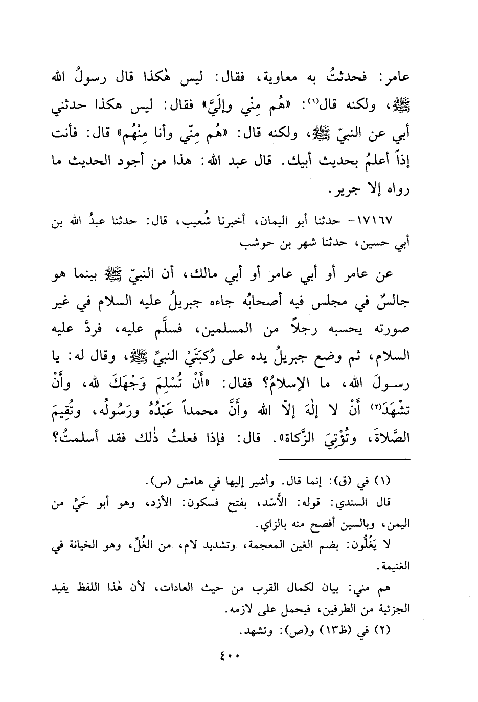 ١٧١٦٧ - حَدَّثَنَا أَبُو الْيَمَانِ، أَخْبَرَنَا شُعَيْبٌ، قَالَ: حَدَّثَنَا عَبْدُ اللهِ بْنُ أَبِي حُسَيْنٍ، حَدَّثَنَا شَهْرُ بْنُ حَوْشَبٍ، عَنْ عَامِرٍ أَوْ أَبِي عَامِرٍ أَوْ أَبِي مَالِكٍ، أَنَّ النَّبِيَّ صَلَّى اللهُ عَلَيْهِ وَسَلَّمَ بَيْنَمَا هُوَ جَالِسٌ فِي مَجْلِسٍ فِيهِ أَصْحَابُهُ جَاءَهُ جِبْرِيلُ عَلَيْهِ السَّلَامُ فِي غَيْرِ صُورَتِهِ يَحْسِبُهُ رَجُلًا مِنَ الْمُسْلِمِينَ، فَسَلَّمَ عَلَيْهِ، فَرَدَّ عَلَيْهِ السَّلَامَ، ثُمَّ وَضَعَ جِبْرِيلُ يَدَهُ عَلَى رُكْبَتَيِ النَّبِيِّ صَلَّى اللهُ عَلَيْهِ وَسَلَّمَ، وَقَالَ لَهُ: يَا رَسُولَ اللهِ، مَا الْإِسْلَامُ؟ فَقَالَ: " أَنْ تُسْلِمَ وَجْهَكَ لِلَّهِ، وَأَنْ تَشْهَدَ (٢) أَنْ لَا إِلَهَ إِلَّا اللهُ وَأَنَّ مُحَمَّدًا عَبْدُهُ وَرَسُولُهُ، وَتُقِيمَ الصَّلَاةَ، وَتُؤْتِيَ الزَّكَاةَ " قَالَ: فَإِذَا فَعَلْتُ ذَلِكَ فَقَدْ أَسْلَمْتُ؟