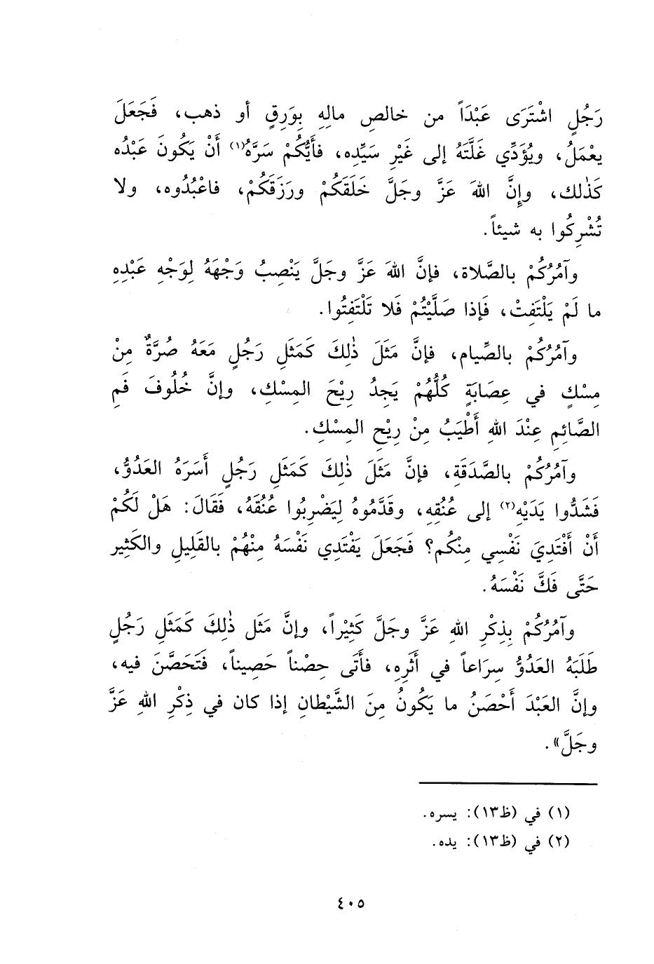 رَجُلٍ اشْتَرَى عَبْدًا مِنْ خَالِصِ مَالِهِ بِوَرِقٍ أَوْ ذَهَبٍ، فَجَعَلَ يَعْمَلُ، وَيُؤَدِّي غَلَّتَهُ إِلَى غَيْرِ سَيِّدِهِ، فَأَيُّكُمْ سَرَّهُ (١) أَنْ يَكُونَ عَبْدُهُ كَذَلِكَ، وَإِنَّ اللهَ عَزَّ وَجَلَّ خَلَقَكُمْ وَرَزَقَكُمْ، فَاعْبُدُوهُ، وَلَا تُشْرِكُوا بِهِ شَيْئًا. وَآمُرُكُمْ بِالصَّلَاةِ، فَإِنَّ اللهَ عَزَّ وَجَلَّ يَنْصِبُ وَجْهَهُ لِوَجْهِ عَبْدِهِ مَا لَمْ يَلْتَفِتْ، فَإِذَا صَلَّيْتُمْ فَلَا تَلْتَفِتُوا. وَآمُرُكُمْ بِالصِّيَامِ، فَإِنَّ مَثَلَ ذَلِكَ كَمَثَلِ رَجُلٍ مَعَهُ صُرَّةٌ مِنْ مِسْكٍ فِي عِصَابَةٍ كُلُّهُمْ يَجِدُ رِيحَ الْمِسْكِ، وَإِنَّ خُلُوفَ فَمِ الصَّائِمِ عِنْدَ اللهِ أَطْيَبُ مِنْ رِيحِ الْمِسْكِ. وَآمُرُكُمْ بِالصَّدَقَةِ، فَإِنَّ مَثَلَ ذَلِكَ كَمَثَلِ رَجُلٍ أَسَرَهُ الْعَدُوُّ، فَشَدُّوا يَدَيْهِ (٢) إِلَى عُنُقِهِ، وَقَدَّمُوهُ لِيَضْرِبُوا عُنُقَهُ، فَقَالَ: هَلْ لَكُمْ أَنْ أَفْتَدِيَ نَفْسِي مِنْكُمْ؟ فَجَعَلَ يَفْتَدِي نَفْسَهُ مِنْهُمْ بِالْقَلِيلِ وَالْكَثِيرِ حَتَّى فَكَّ نَفْسَهُ. وَآمُرُكُمْ بِذِكْرِ اللهِ عَزَّ وَجَلَّ كَثِيرًا، وَإِنَّ مَثَلَ ذَلِكَ كَمَثَلِ رَجُلٍ طَلَبَهُ الْعَدُوُّ سِرَاعًا فِي أَثَرِهِ، فَأَتَى حِصْنًا حَصِينًا، فَتَحَصَّنَ فِيهِ، وَإِنَّ الْعَبْدَ أَحْصَنُ مَا يَكُونُ مِنَ الشَّيْطَانِ إِذَا كَانَ فِي ذِكْرِ اللهِ عَزَّ وَجَلَّ "