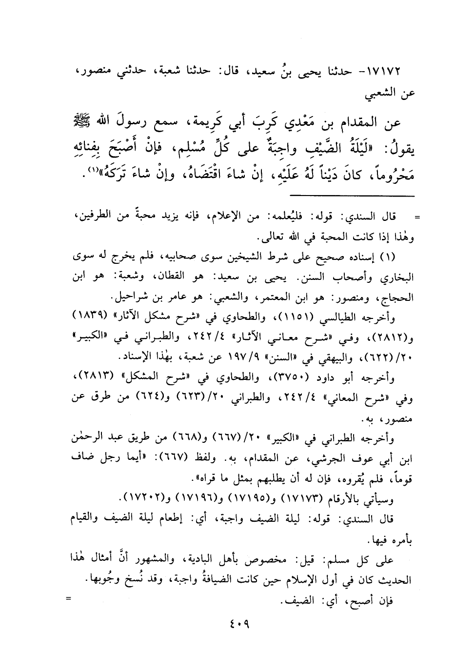 ١٧١٧٢ - حَدَّثَنَا يَحْيَى بْنُ سَعِيدٍ، قَالَ: حَدَّثَنَا شُعْبَةُ، حَدَّثَنِي مَنْصُورٌ، عَنِ الشَّعْبِيِّ، عَنِ الْمِقْدَامِ بْنِ مَعْدِي كَرِبَ أَبِي كَرِيمَةَ، سَمِعَ رَسُولَ اللهِ صَلَّى اللهُ عَلَيْهِ وَسَلَّمَ يَقُولُ: " لَيْلَةُ الضَّيْفِ وَاجِبَةٌ عَلَى كُلِّ مُسْلِمٍ، فَإِنْ أَصْبَحَ بِفِنَائِهِ مَحْرُومًا، كَانَ دَيْنًا لَهُ عَلَيْهِ، إِنْ شَاءَ اقْتَضَاهُ، وَإِنْ شَاءَ تَرَكَهُ " (١)