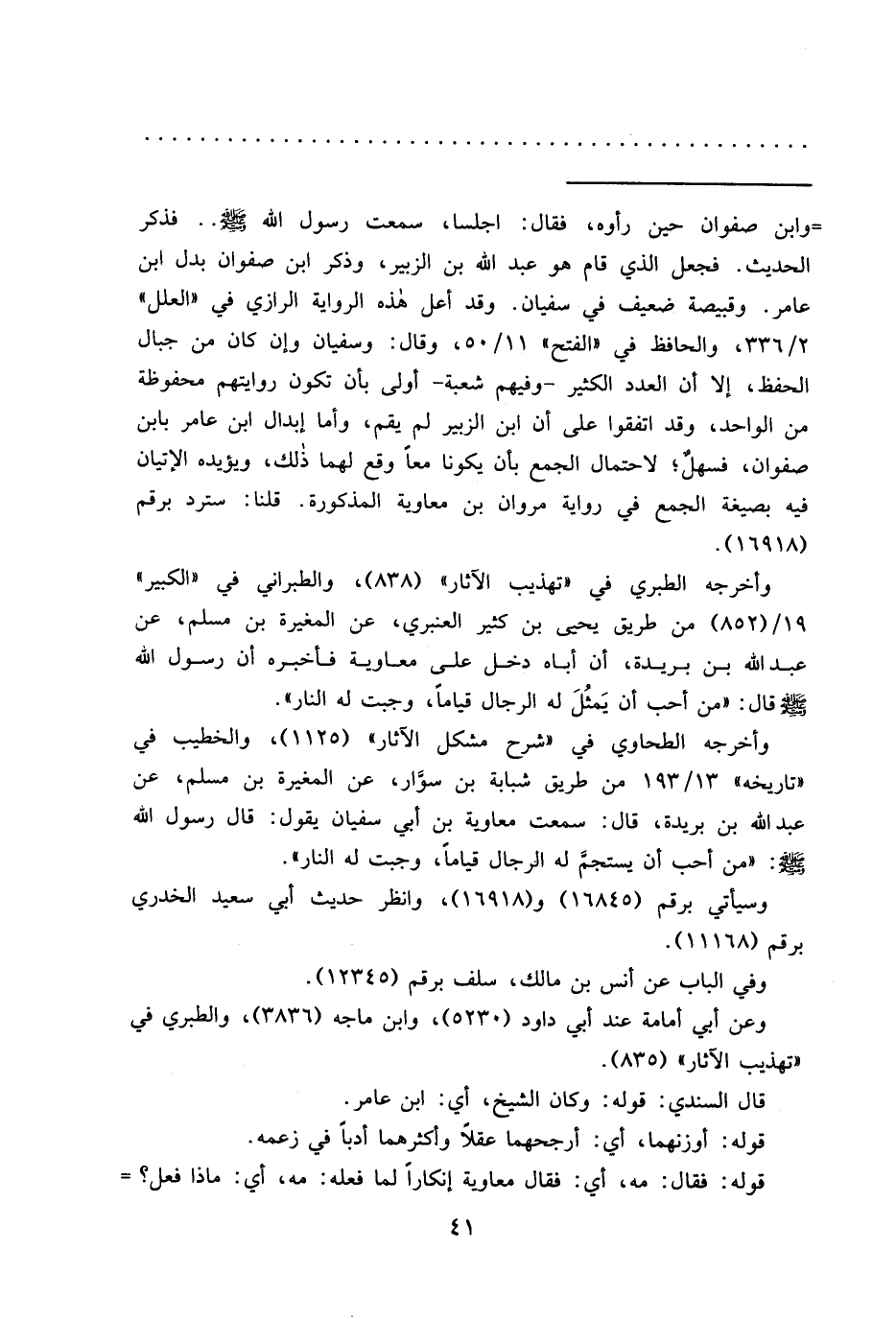 = وابن صفوان حين رأوه، فقال: اجلسا، سمعت رسول الله صَلَّى اللهُ عَلَيْهِ وَسَلَّمَ.. فذكر الحديث. فجعل الذي قام هو عبد الله بن الزبير، وذكر ابن صفوان بدل ابن عامر. وقبيصة ضعيف في سفيان. وقد أعل هذه الرواية الرازي في "العلل" ٢/٣٣٦، والحافظ في "الفتح" ١١/٥٠، وقال: وسفيان وإن كان من جبال الحفظ، إلا أن العدد الكثير- وفيهم شعبة- أولى بأن تكون روايتهم محفوظة من الواحد، وقد اتفقوا على أن ابن الزبير لم يقم، وأما إبدال ابن عامر بابن صفوان، فسهلٌ؛ لاحتمال الجمع بأن يكونا معاً وقع لهما ذلك، ويؤيده الإتيان فيه بصيغة الجمع في رواية مروان بن معاوية المذكورة. قلنا: سترد برقم (١٦٩١٨) .