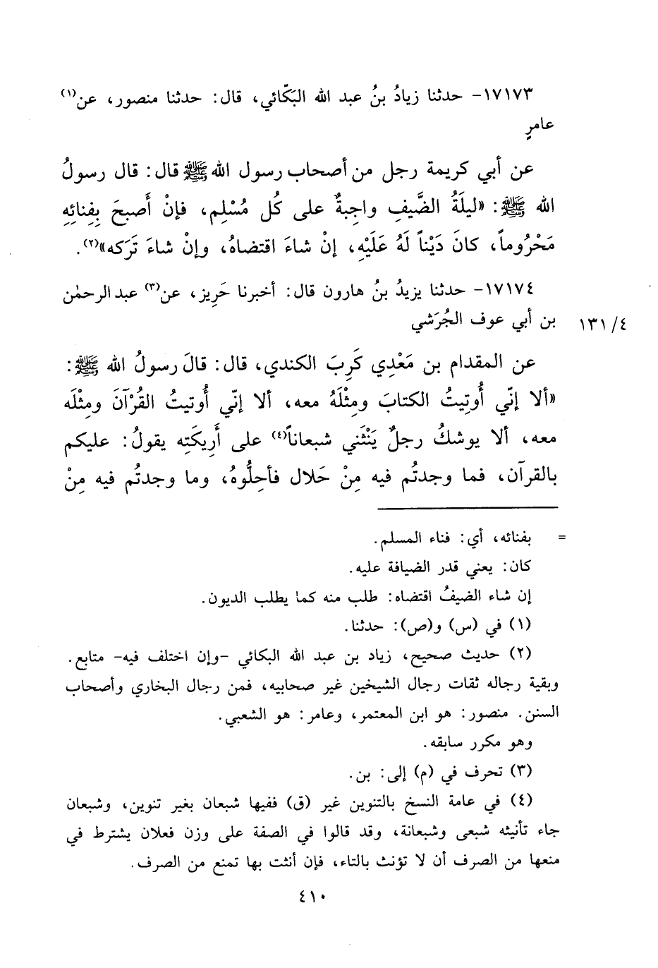 ١٧١٧٣ - حَدَّثَنَا زِيَادُ بْنُ عَبْدِ اللهِ الْبَكَّائِيُّ، قَالَ: حَدَّثَنَا مَنْصُورٌ، عَنْ (١) عَامِرٍ، عَنْ أَبِي كَرِيمَةَ، رَجُلٍ مِنْ أَصْحَابِ رَسُولِ اللهِ صَلَّى اللهُ عَلَيْهِ وَسَلَّمَ قَالَ: قَالَ رَسُولُ اللهِ صَلَّى اللهُ عَلَيْهِ وَسَلَّمَ: " لَيْلَةُ الضَّيْفِ وَاجِبَةٌ عَلَى كُلِّ مُسْلِمٍ، فَإِنْ أَصْبَحَ بِفِنَائِهِ مَحْرُومًا، كَانَ دَيْنًا لَهُ عَلَيْهِ، إِنْ شَاءَ اقْتَضَاهُ، وَإِنْ شَاءَ تَرَكَهُ " (٢)