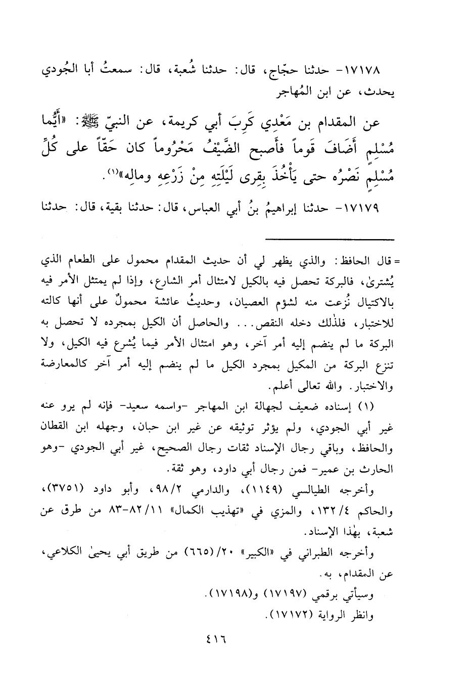 ١٧١٧٨ - حَدَّثَنَا حَجَّاجٌ، قَالَ: حَدَّثَنَا شُعْبَةُ، قَالَ: سَمِعْتُ أَبَا الْجُودِيِّ، يُحَدِّثُ عَنِ ابْنِ الْمُهَاجِرِ، عَنِ الْمِقْدَامِ بْنِ مَعْدِي كَرِبَ أَبِي كَرِيمَةَ، عَنِ النَّبِيِّ صَلَّى اللهُ عَلَيْهِ وَسَلَّمَ: " أَيُّمَا مُسْلِمٍ أَضَافَ قَوْمًا فَأَصْبَحَ الضَّيْفُ مَحْرُومًا كَانَ حَقًا عَلَى كُلِّ مُسْلِمٍ نَصْرَهُ حَتَّى يَأْخُذَ بِقِرَى لَيْلَتِهِ مِنْ زَرْعِهِ وَمَالِهِ " (١)