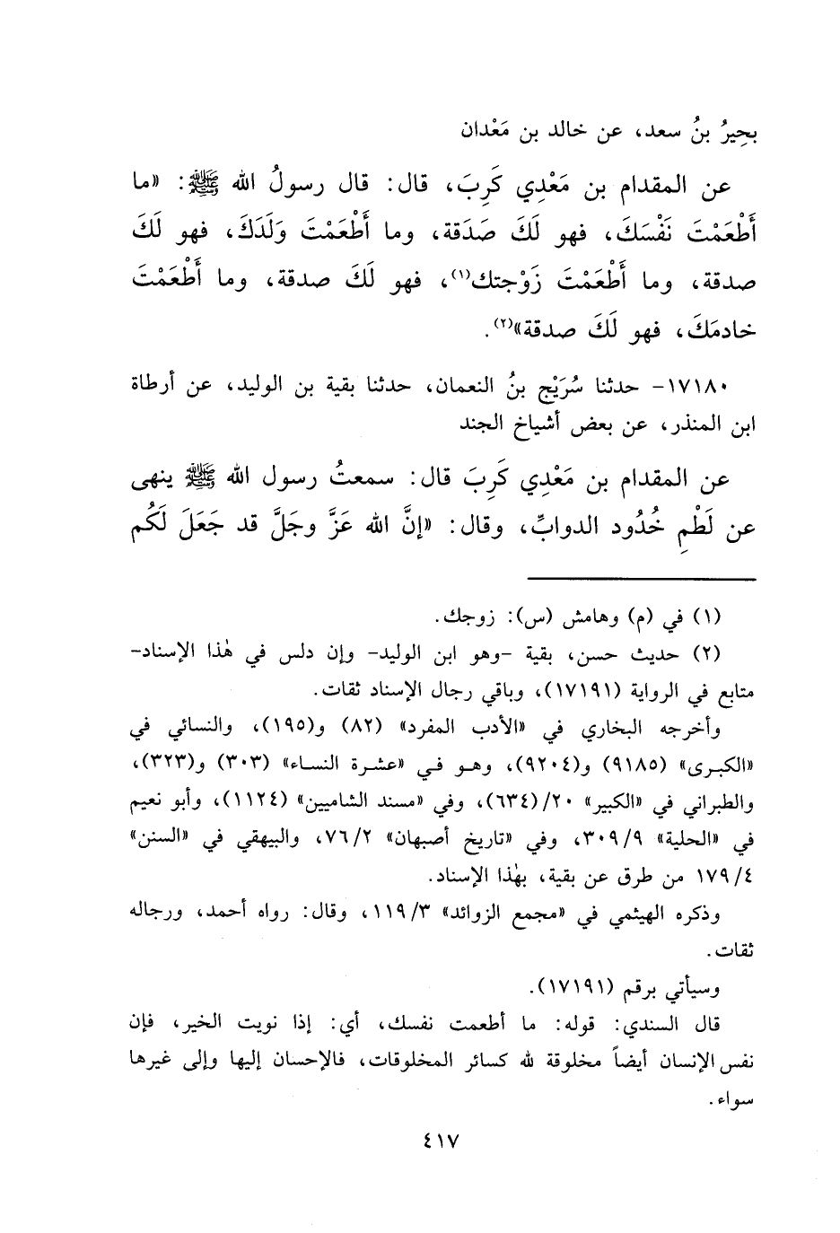 بَحِيرُ بْنُ سَعْدٍ، عَنْ خَالِدِ بْنِ مَعْدَانَ، عَنِ الْمِقْدَامِ بْنِ مَعْدِي كَرِبَ، قَالَ: قَالَ رَسُولُ اللهِ صَلَّى اللهُ عَلَيْهِ وَسَلَّمَ: " مَا أَطْعَمْتَ نَفْسَكَ، فَهُوَ لَكَ صَدَقَةٌ، وَمَا أَطْعَمْتَ وَلَدَكَ، فَهُوَ لَكَ صَدَقَةٌ، وَمَا أَطْعَمْتَ زَوْجَتَكَ (١) ، فَهُوَ لَكَ صَدَقَةٌ، وَمَا أَطْعَمْتَ خَادِمَكَ، فَهُوَ لَكَ صَدَقَةٌ " (٢)