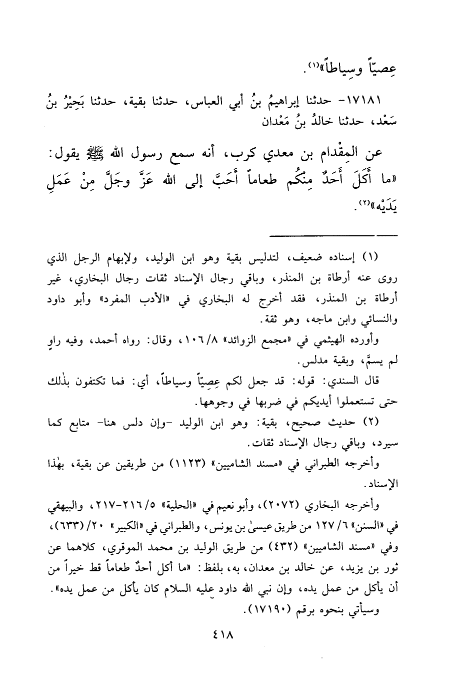١٧١٨١ - حَدَّثَنَا إِبْرَاهِيمُ بْنُ أَبِي الْعَبَّاسِ، حَدَّثَنَا بَقِيَّةُ، حَدَّثَنَا بَحِيرُ بْنُ سَعْدٍ، حَدَّثَنَا خَالِدُ بْنُ مَعْدَانَ، عَنِ الْمِقْدَامِ بْنِ مَعْدِي كَرِبَ، أَنَّهُ سَمِعَ رَسُولَ اللهِ صَلَّى اللهُ عَلَيْهِ وَسَلَّمَ يَقُولُ: " مَا أَكَلَ أَحَدٌ مِنْكُمْ طَعَامًا أَحَبَّ إِلَى اللهِ عَزَّ وَجَلَّ مِنْ عَمَلِ يَدَيْهِ " (٢)