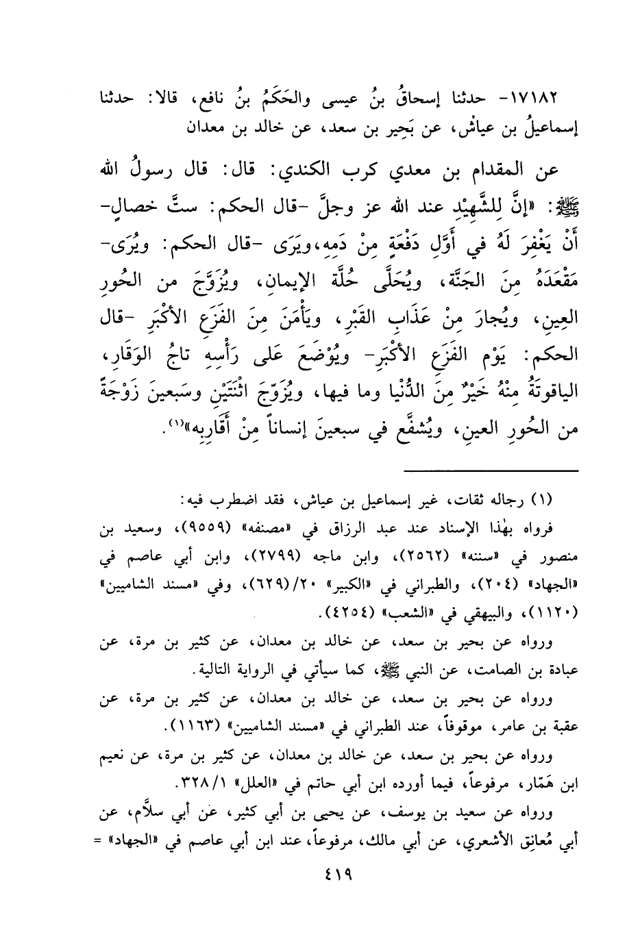 ١٧١٨٢ - حَدَّثَنَا إِسْحَاقُ بْنُ عِيسَى، وَالْحَكَمُ بْنُ نَافِعٍ، قَالَا: حَدَّثَنَا إِسْمَاعِيلُ بْنُ عَيَّاشٍ، عَنْ بَحِيرِ بْنِ سَعْدٍ، عَنْ خَالِدِ بْنِ مَعْدَانَ، عَنِ الْمِقْدَامِ بْنِ مَعْدِي كَرِبَ الْكِنْدِيِّ، قَالَ: قَالَ رَسُولُ اللهِ صَلَّى اللهُ عَلَيْهِ وَسَلَّمَ: " إِنَّ لِلشَّهِيدِ عِنْدَ اللهِ عَزَّ وَجَلَّ - قَالَ الْحَكَمُ: سِتَّ خِصَالٍ - أَنْ يُغْفَرَ لَهُ فِي أَوَّلِ دَفْعَةٍ مِنْ دَمِهِ، وَيَرَى - قَالَ الْحَكَمُ: وَيُرَى - مَقْعَدَهُ مِنَ الْجَنَّةِ، وَيُحَلَّى حُلَّةَ الْإِيمَانِ، وَيُزَوَّجَ مِنَ الْحُورِ الْعِينِ، وَيُجَارَ مِنْ عَذَابِ الْقَبْرِ، وَيَأْمَنَ مِنَ الْفَزَعِ الْأَكْبَرِ - قَالَ الْحَكَمُ: يَوْمَ الْفَزَعِ الْأَكْبَرِ - وَيُوضَعَ عَلَى رَأْسِهِ تَاجُ الْوَقَارِ، الْيَاقُوتَةُ مِنْهُ خَيْرٌ مِنَ الدُّنْيَا وَمَا فِيهَا، وَيُزَوَّجَ اثْنَتَيْنِ وَسَبْعِينَ زَوْجَةً مِنَ الْحُورِ الْعِينِ، وَيُشَفَّعَ فِي سَبْعِينَ إِنْسَانًا مِنْ أَقَارِبِهِ " (١)
