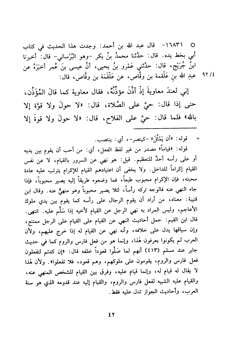 ° ١٦٨٣١ - قَالَ عَبْدُ اللهِ بْنُ أَحْمَدَ: وَجَدْتُ هَذَا الْحَدِيثَ فِي كِتَابِ أَبِي بِخَطِّ يَدِهِ قَالَ: حَدَّثَنَا مُحَمَّدُ بْنُ بَكْرٍ وَهُوَ البُرْسَانِيُّ، قَالَ: أَخْبَرَنَا ابْنُ جُرَيْجٍ، قَالَ: حَدَّثَنِي عَمْرُو بْنُ يَحْيَى، أَنَّ عِيسَى بْنَ عُمَرَ، أَخْبَرَهُ، عَنْ عَبْدِ اللهِ بْنِ عَلْقَمَةَ بْنِ وَقَّاصٍ، عَنْ عَلْقَمَةَ بْنِ وَقَّاصٍ، قَالَ: إِنِّي لَعِنْدَ مُعَاوِيَةَ إِذْ أَذَّنَ مُؤَذِّنُهُ، فَقَالَ مُعَاوِيَةُ، كَمَا قَالَ الْمُؤَذِّنُ، حَتَّى إِذَا قَالَ: حَيَّ عَلَى الصَّلَاةِ، قَالَ: " لَا حَوْلَ وَلَا قُوَّةَ إِلَّا بِاللهِ " فَلَمَّا قَالَ: حَيَّ عَلَى الْفَلَاحِ، قَالَ: " لَا حَوْلَ وَلَا قُوَّةَ إِلَّا
