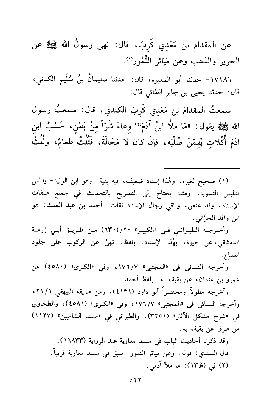 ١٧١٨٦ - حَدَّثَنَا أَبُو الْمُغِيرَةِ، قَالَ: حَدَّثَنَا سُلَيْمَانُ بْنُ سُلَيْمٍ الْكِنَانِيُّ، قَالَ: حَدَّثَنَا يَحْيَى بْنُ جَابِرٍ الطَّائِيُّ، قَالَ: سَمِعْتُ الْمِقْدَامَ بْنَ مَعْدِي كَرِبَ الْكِنْدِيَّ، قَالَ: سَمِعْتُ رَسُولَ اللهِ صَلَّى اللهُ عَلَيْهِ وَسَلَّمَ يَقُولُ: " مَا مَلَأَ ابْنُ آدَمَ (٢) وِعَاءً شَرًّا مِنْ بَطْنٍ، حَسْبُ ابْنِ آدَمَ أُكُلَاتٌ يُقِمْنَ صُلْبَهُ، فَإِنْ كَانَ لَا مَحَالَةَ، فَثُلُثُ طَعَامٍ، وَثُلُثُ