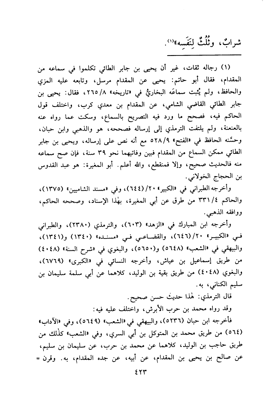 (١) رجاله ثقات، غير أن يحيى بن جابر الطائي تكلموا في سماعه من المقدام، فقال أبو حاتم: يحيى عن المقدام مرسل، وتابعه عليه المزي والحافظ، ولم يُثبت سماعَه البخاريُ في "تاريخه" ٨/٢٦٥، فقال: يحيى بن جابر الطائي القاضي الشامي، عن المقدام بن معدي كرب، واختلف قول الحاكم فيه، فصحح ما ورد فيه التصريح بالسماع، وسكت عما رواه عنه بالعنعنة، ولم يلتفت الترمذي إلى إرساله فصححه، هو والذهبي وابن حبان، وحسَّنه الحافظ في "الفتح" ٩/٥٢٨ مع أنه نص على إرساله، ويحيى بن جابر الطائي ممكن السماع من المقدام فبين وفاتيهما نحو ٣٩ سنة، فإن صح سماعه منه فالحديث صحيح، وإلا فمنقطع، والله أعلم. أبو المغيرة: هو عبد القدوس بن الحجاج الخولاني.