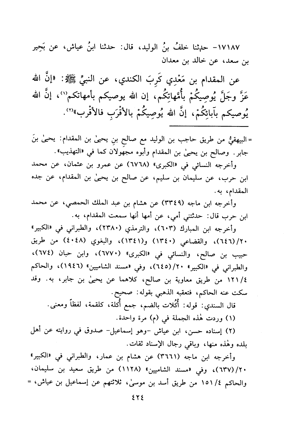 ١٧١٨٧ - حَدَّثَنَا خَلَفُ بْنُ الْوَلِيدِ، قَالَ: حَدَّثَنَا ابْنُ عَيَّاشٍ، عَنْ بَحِيرِ بْنِ سَعْدٍ، عَنْ خَالِدِ بْنِ مَعْدَانَ، عَنِ الْمِقْدَامِ بْنِ مَعْدِي كَرِبَ الْكِنْدِيِّ، عَنِ النَّبِيِّ صَلَّى اللهُ عَلَيْهِ وَسَلَّمَ: " إِنَّ اللهَ عَزَّ وَجَلَّ يُوصِيكُمْ بِأُمَّهَاتِكُمْ، إِنَّ اللهَ يُوصِيكُمْ بِأُمَّهَاتِكُمْ (١) ، إِنَّ اللهَ يُوصِيكُمْ بِآبَائِكُمْ، إِنَّ اللهَ يُوصِيكُمْ بِالْأَقْرَبِ فَالْأَقْرَبِ " (٢)
