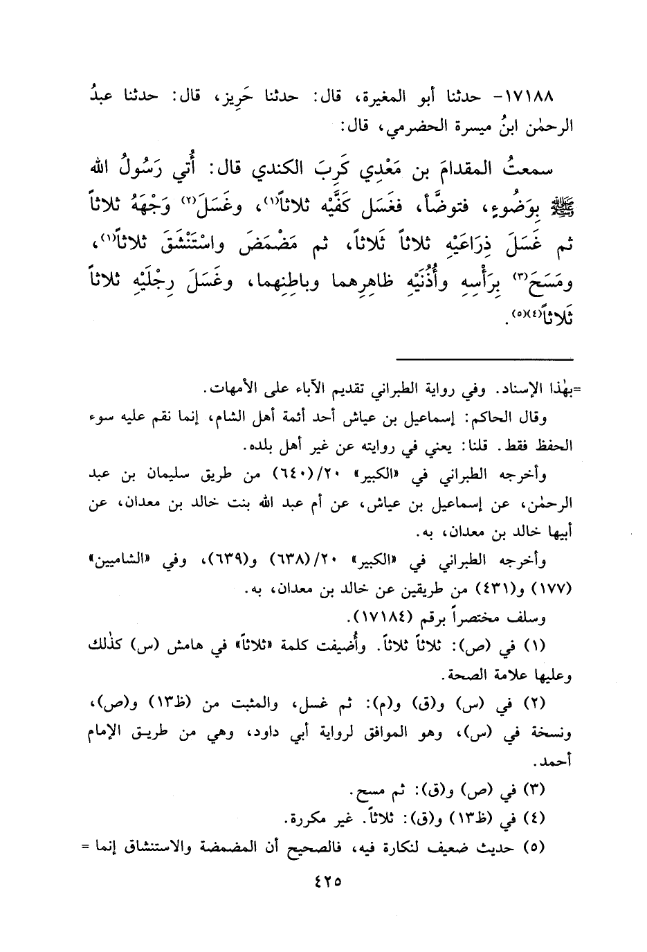 ١٧١٨٨ - حَدَّثَنَا أَبُو الْمُغِيرَةِ، قَالَ: حَدَّثَنَا حَرِيزٌ، قَالَ: حَدَّثَنَا عَبْدُ الرَّحْمَنِ بْنُ مَيْسَرَةَ الْحَضْرَمِيُّ، قَالَ: سَمِعْتُ الْمِقْدَامَ بْنَ مَعْدِي كَرِبَ الْكِنْدِيَّ، قَالَ: " أُتِيَ رَسُولُ اللهِ صَلَّى اللهُ عَلَيْهِ وَسَلَّمَ بِوَضُوءٍ، فَتَوَضَّأَ، فَغَسَلَ كَفَّيْهِ ثَلَاثًا (١) ، وَغَسَلَ (٢) وَجْهَهُ ثَلَاثًا، ثُمَّ غَسَلَ ذِرَاعَيْهِ ثَلَاثًا ثَلَاثًا، ثُمَّ مَضْمَضَ وَاسْتَنْشَقَ ثَلَاثًا (١) ، وَمَسَحَ (٣) بِرَأْسِهِ وَأُذُنَيْهِ ظَاهِرِهِمَا وَبَاطِنِهِمَا، وَغَسَلَ رِجْلَيْهِ ثَلَاثًا ثَلَاثًا (٤) " (٥)