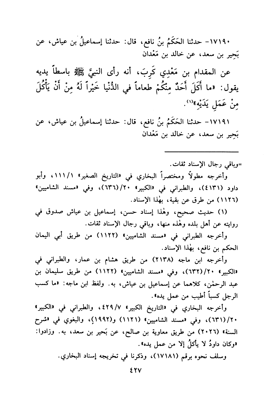١٧١٩٠ - حَدَّثَنَا الْحَكَمُ بْنُ نَافِعٍ، قَالَ: حَدَّثَنَا إِسْمَاعِيلُ بْنُ عَيَّاشٍ، عَنْ بَحِيرِ بْنِ سَعْدٍ، عَنْ خَالِدِ بْنِ مَعْدَانَ، عَنِ الْمِقْدَامِ بْنِ مَعْدِي كَرِبَ، أَنَّهُ رَأَى النَّبِيَّ صَلَّى اللهُ عَلَيْهِ وَسَلَّمَ بَاسِطًا يَدَيْهِ يَقُولُ: " مَا أَكَلَ أَحَدٌ مِنْكُمْ طَعَامًا فِي الدُّنْيَا خَيْرًا لَهُ مِنْ أَنْ يَأْكُلَ مِنْ عَمَلِ يَدَيْهِ " (١)