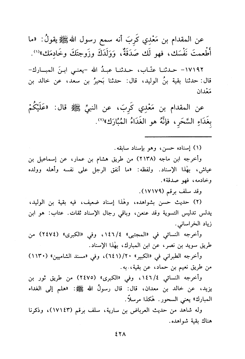 ١٧١٩٢ - حَدَّثَنَا عَتَّابٌ، حَدَّثَنَا عَبْدُ اللهِ يَعْنِي ابْنَ الْمُبَارَكِ، قَالَ: حَدَّثَنَا بَقِيَّةُ بْنُ الْوَلِيدِ، قَالَ: حَدَّثَنَا بَحِيرُ بْنُ سَعْدٍ، عَنْ خَالِدِ بْنِ مَعْدَانَ، عَنِ الْمِقْدَامِ بْنِ مَعْدِي كَرِبَ، عَنِ النَّبِيِّ صَلَّى اللهُ عَلَيْهِ وَسَلَّمَ قَالَ: " عَلَيْكُمْ بِغَدَاءِ السَّحَرِ، فَإِنَّهُ هُوَ الْغِدَاءُ الْمُبَارَكُ " (٢)