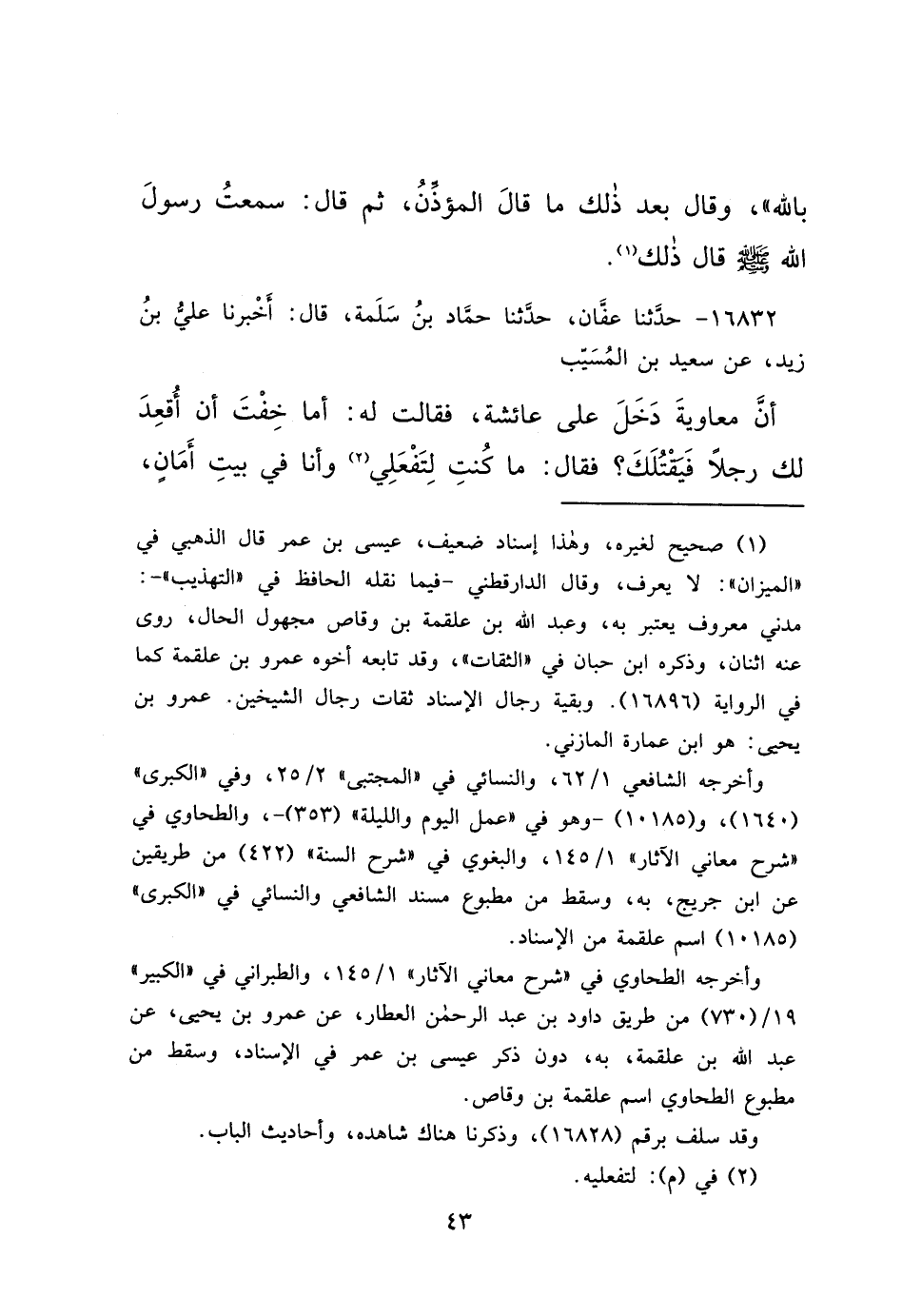 ١٦٨٣٢ - حَدَّثَنَا عَفَّانُ، حَدَّثَنَا حَمَّادُ بْنُ سَلَمَةَ، قَالَ: أَخْبَرَنَا عَلِيُّ بْنُ زَيْدٍ، عَنْ سَعِيدِ بْنِ الْمُسَيِّبِ، أَنَّ مُعَاوِيَةَ، دَخَلَ عَلَى عَائِشَةَ، فَقَالَتْ لَهُ: أَمَا خِفْتَ أَنْ أُقْعِدَ لَكَ رَجُلًا فَيَقْتُلَكَ؟ فَقَالَ: مَا كُنْتِ لِتَفْعَلِي (٢) وَأَنَا فِي بَيْتِ أَمَانٍ،