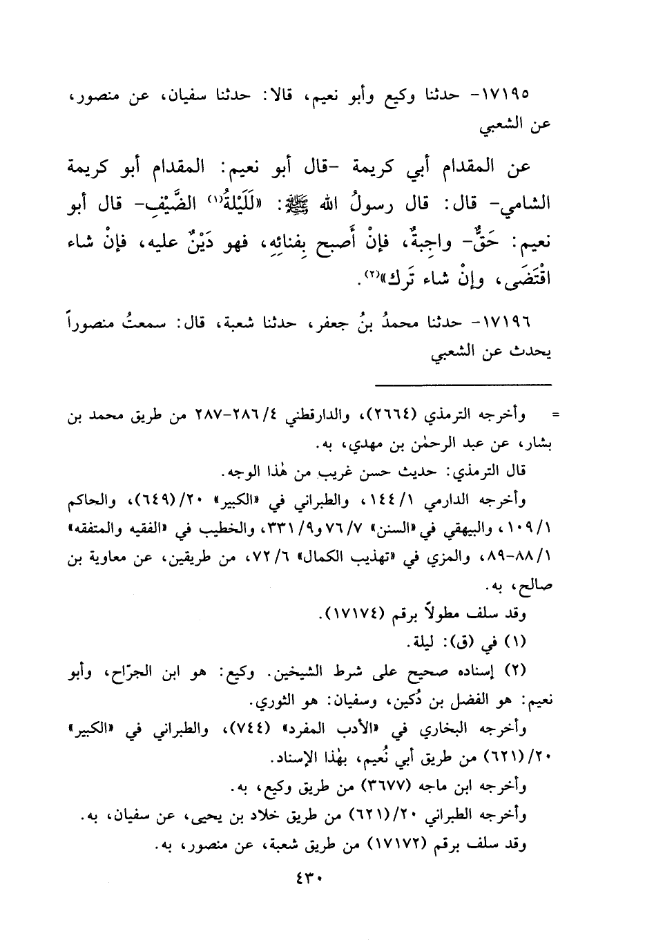 ١٧١٩٥ - حَدَّثَنَا وَكِيعٌ، وَأَبُو نُعَيْمٍ، قَالَا: حَدَّثَنَا سُفْيَانُ، عَنْ مَنْصُورٍ، عَنِ الشَّعْبِيِّ، عَنِ الْمِقْدَامِ أَبِي كَرِيمَةَ، قَالَ أَبُو نُعَيْمٍ: الْمِقْدَامُ أَبُو كَرِيمَةَ الشَّامِيُّ، قَالَ: قَالَ رَسُولُ اللهِ صَلَّى اللهُ عَلَيْهِ وَسَلَّمَ: " لَلَيْلَةُ (١) الضَّيْفِ - قَالَ أَبُو نُعَيْمٍ: حَقٌّ - وَاجِبَةٌ، فَإِنْ أَصْبَحَ بِفِنَائِهِ، فَهُوَ دَيْنٌ عَلَيْهِ، فَإِنْ شَاءَ اقْتَضَى، وَإِنْ شَاءَ تَرَكَ " (٢)