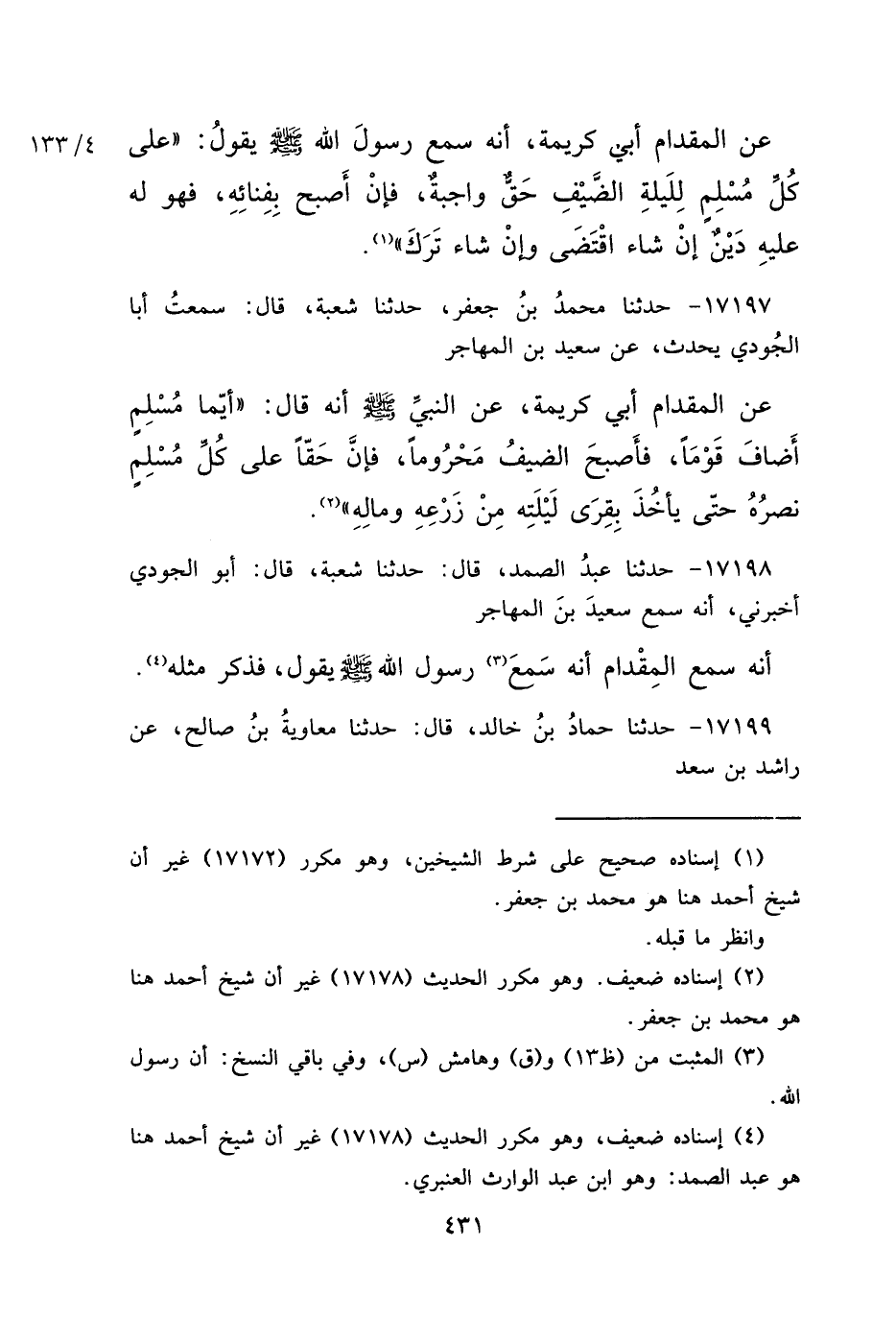 ١٧١٩٨ - حَدَّثَنَا عَبْدُ الصَّمَدِ، قَالَ: حَدَّثَنَا شُعْبَةُ، قَالَ: أَبُو الْجُودِيِّ، أَخْبَرَنِي، أَنَّهُ سَمِعَ سَعِيدَ بْنَ الْمُهَاجِرِ، أَنَّهُ سَمِعَ الْمِقْدَامَ، أَنَّهُ سَمِعَ (٣) رَسُولَ اللهِ صَلَّى اللهُ عَلَيْهِ وَسَلَّمَ يَقُولُ، فَذَكَرَ مِثْلَهُ (٤)