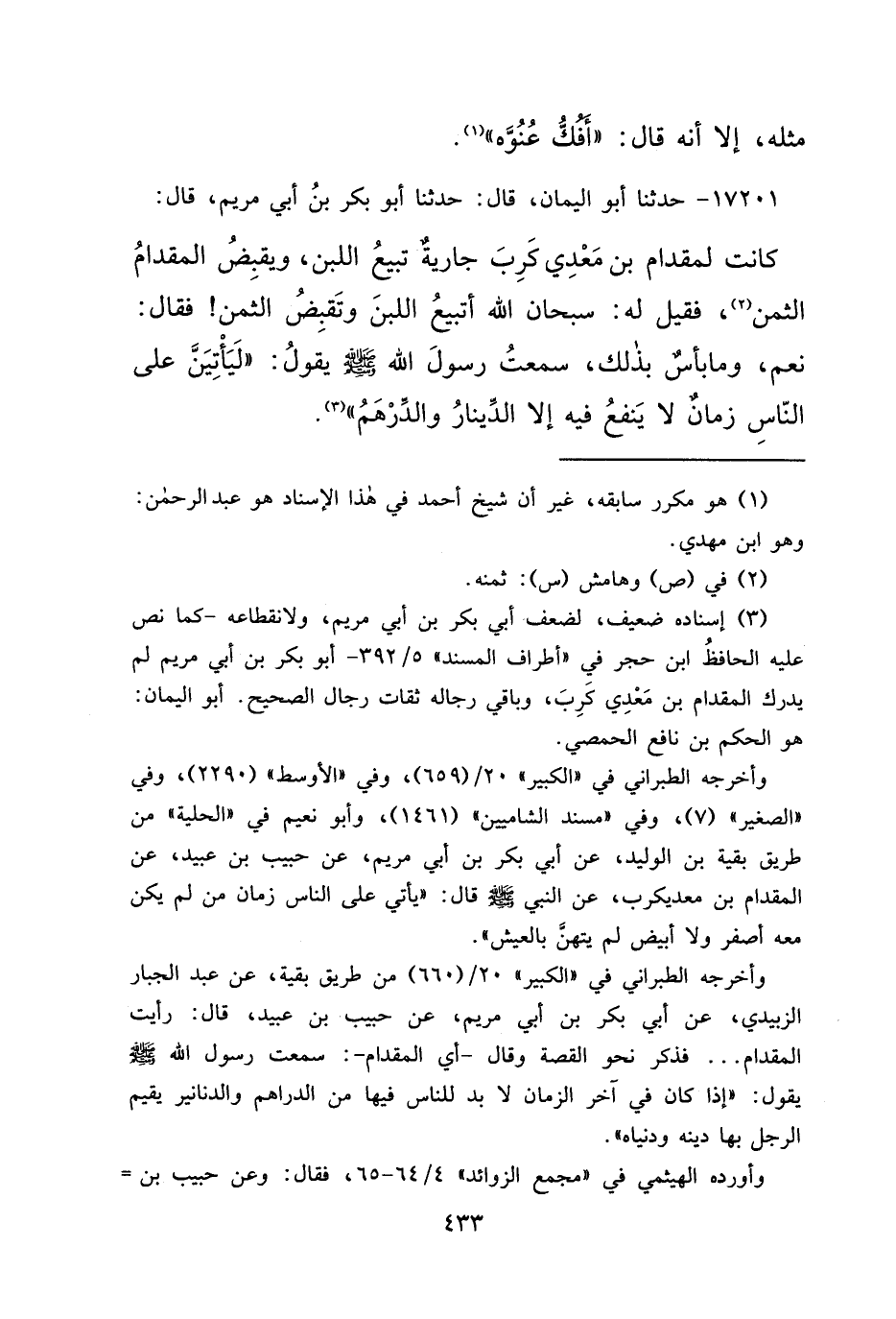 ١٧٢٠١ - حَدَّثَنَا أَبُو الْيَمَانِ، قَالَ: حَدَّثَنَا أَبُو بَكْرِ بْنُ أَبِي مَرْيَمَ، قَالَ: كَانَتْ لِمِقْدَامِ بْنِ مَعْدِي كَرِبَ، جَارِيَةٌ تَبِيعُ اللَّبَنَ، وَيَقْبِضُ الْمِقْدَامُ الثَّمَنَ، فَقِيلَ لَهُ: سُبْحَانَ اللهِ أَتَبِيعُ اللَّبَنَ وَتَقْبِضُ الثَّمَنَ (٢) فَقَالَ: نَعَمْ، وَمَا بَأْسٌ بِذَلِكَ، سَمِعْتُ رَسُولَ اللهِ صَلَّى اللهُ عَلَيْهِ وَسَلَّمَ يَقُولُ: " لَيَأْتِيَنَّ عَلَى النَّاسِ زَمَانٌ لَا يَنْفَعُ فِيهِ إِلَّا الدِّينَارُ وَالدِّرْهَمُ " (٣)