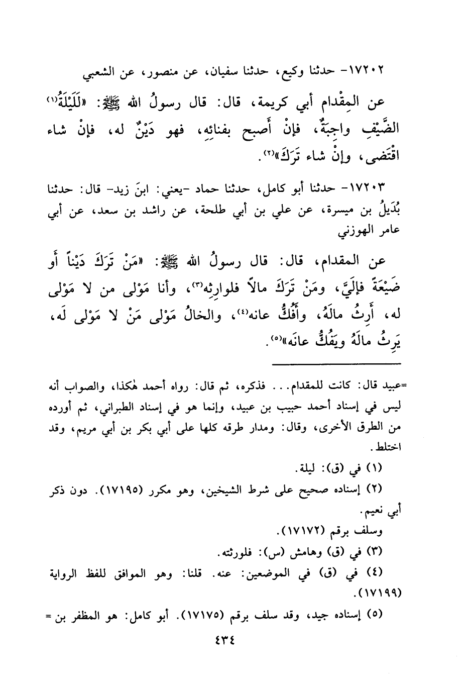 ١٧٢٠٢ - حَدَّثَنَا وَكِيعٌ، حَدَّثَنَا سُفْيَانُ، عَنْ مَنْصُورٍ، عَنِ الشَّعْبِيِّ، عَنِ الْمِقْدَامِ أَبِي كَرِيمَةَ، قَالَ: قَالَ رَسُولُ اللهِ صَلَّى اللهُ عَلَيْهِ وَسَلَّمَ: " لَلَيْلَةُ (١) الضَّيْفِ وَاجِبَةٌ، فَإِنْ أَصْبَحَ بِفِنَائِهِ، فَهُوَ دَيْنٌ لَهُ، فَإِنْ شَاءَ اقْتَضَى، وَإِنْ شَاءَ تَرَكَ " (٢)