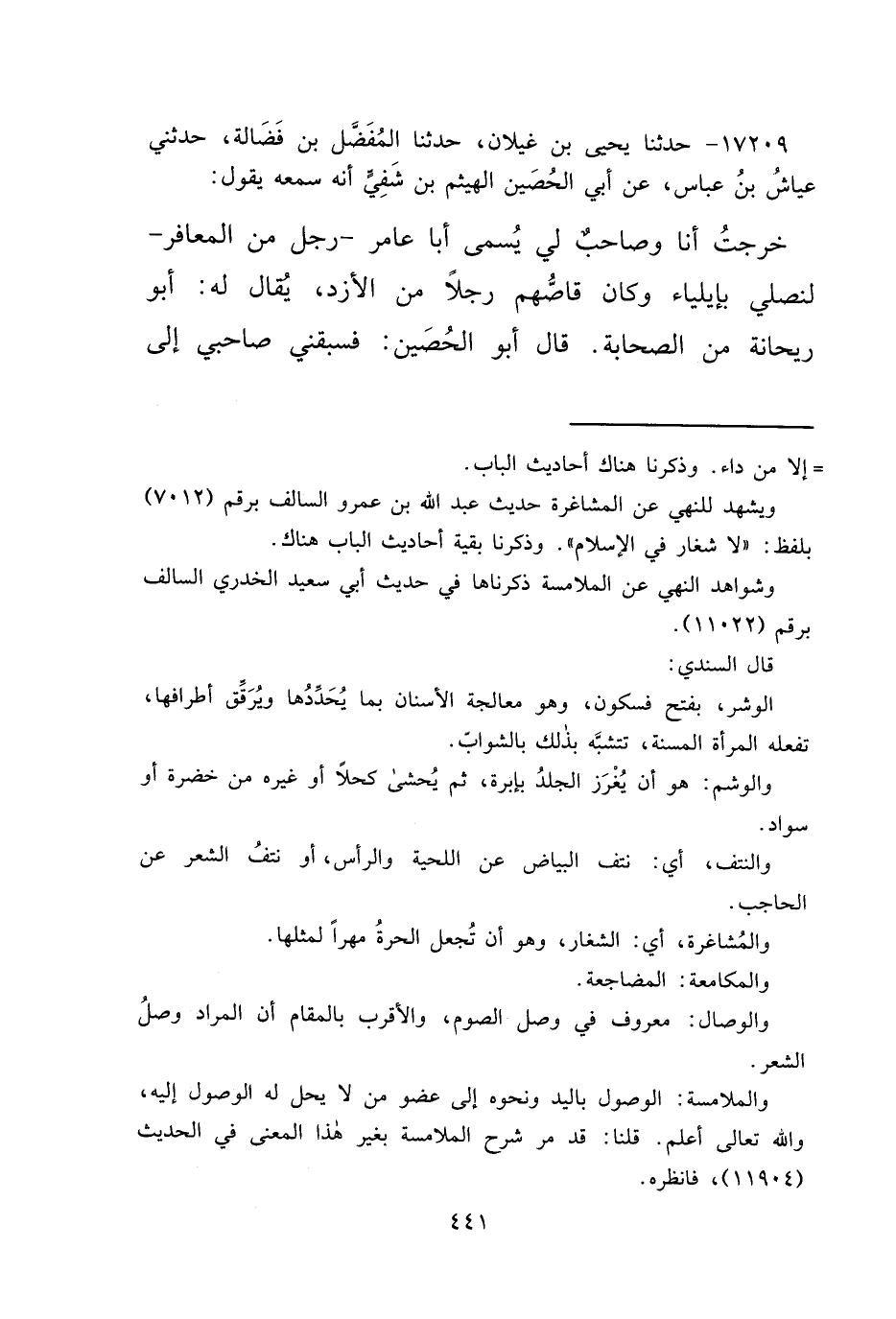 ١٧٢٠٩ - حَدَّثَنَا يَحْيَى بْنُ غَيْلَانَ، حَدَّثَنَا الْمُفَضَّلُ بْنُ فَضَالَةَ، حَدَّثَنِي عَيَّاشُ بْنُ عَبَّاسٍ، عَنْ أَبِي الْحُصَيْنِ الْهَيْثَمِ بْنِ شُفَيٍّ، أَنَّهُ سَمِعَهُ يَقُولُ: خَرَجْتُ أَنَا وَصَاحِبٌ لِي يُسَمَّى أَبَا عَامِرٍ - رَجُلٌ مِنَ الْمَعَافِرِ -، لِيُصَلِّيَ بِإِيلِيَاءَ وَكَانَ قَاصُّهُمْ رَجُلًا مِنَ الْأَزْدِ، يُقَالُ لَهُ: أَبُو رَيْحَانَةَ مِنَ الصَّحَابَةِ. قَالَ أَبُو الْحُصَيْنِ: فَسَبَقَنِي صَاحِبِي إِلَى