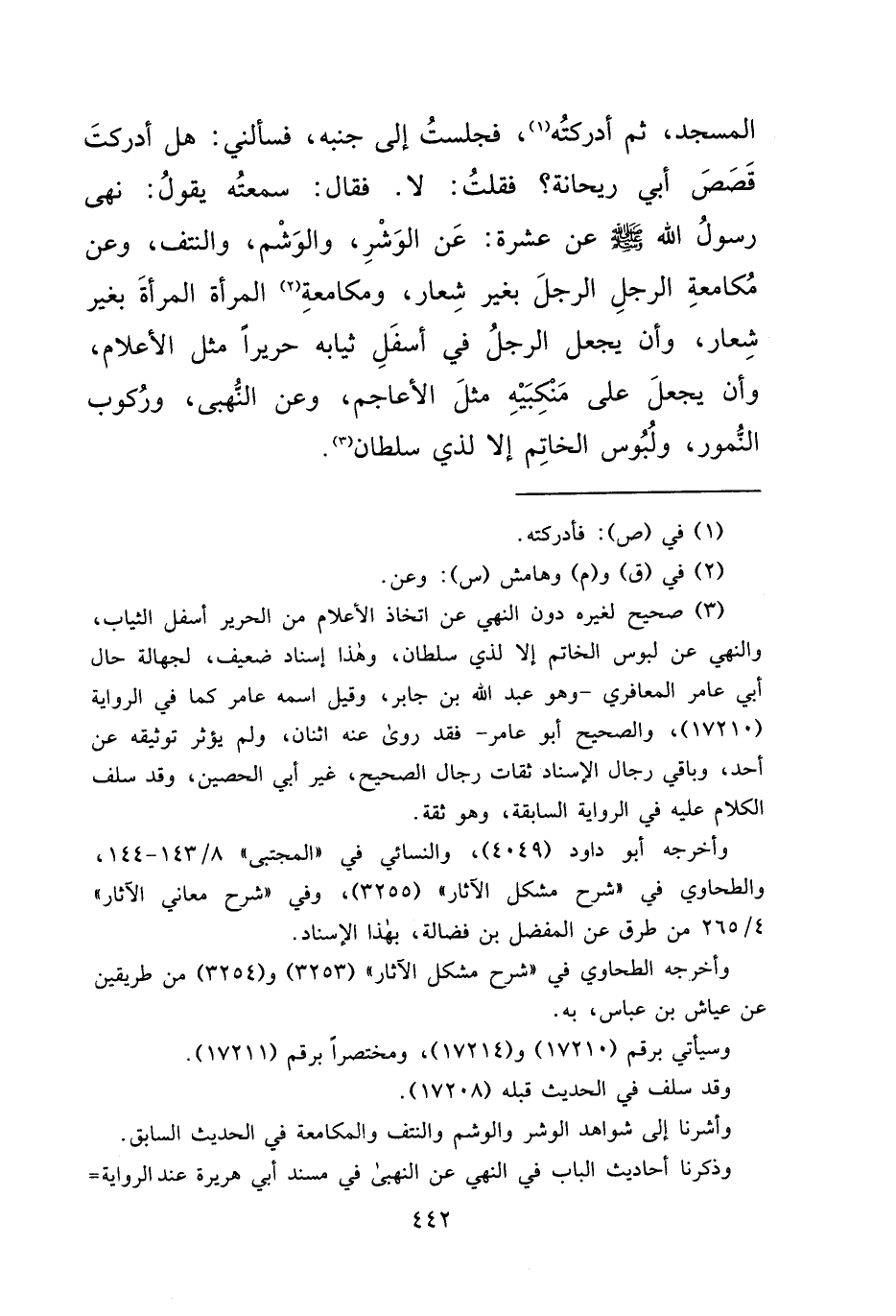 الْمَسْجِدِ، ثُمَّ أَدْرَكْتُهُ (١) ، فَجَلَسْتُ إِلَى جَنْبِهِ، فَسَأَلَنِي: هَلْ أَدْرَكْتَ قَصَصَ أَبِي رَيْحَانَةَ؟ فَقُلْتُ: لَا. فَقَالَ: سَمِعْتُهُ يَقُولُ: " نَهَى رَسُولُ اللهِ صَلَّى اللهُ عَلَيْهِ وَسَلَّمَ عَنْ عَشْرَةٍ: عَنِ الْوَشْرِ، وَالْوَشْمِ، وَالنَّتْفِ، وَعَنْ مُكَامَعَةِ الرَّجُلِ الرَّجُلَ بِغَيْرِ شِعَارٍ، وَمُكَامَعَةِ (٢) الْمَرْأَةِ الْمَرْأَةَ بِغَيْرِ شِعَارٍ، وَأَنْ يَجْعَلَ الرَّجُلُ فِي أَسْفَلِ ثِيَابِهِ حَرِيرًا مِثْلَ الْأَعْلَامِ، وَأَنْ يَجْعَلَ عَلَى مَنْكِبَيْهِ مِثْلَ الْأَعَاجِمِ، وَعَنِ النُّهْبَى، وَرُكُوبِ النُّمُورِ، وَلَبُوسِ الْخَاتَمِ إِلَّا لِذِي سُلْطَانٍ " (٣)